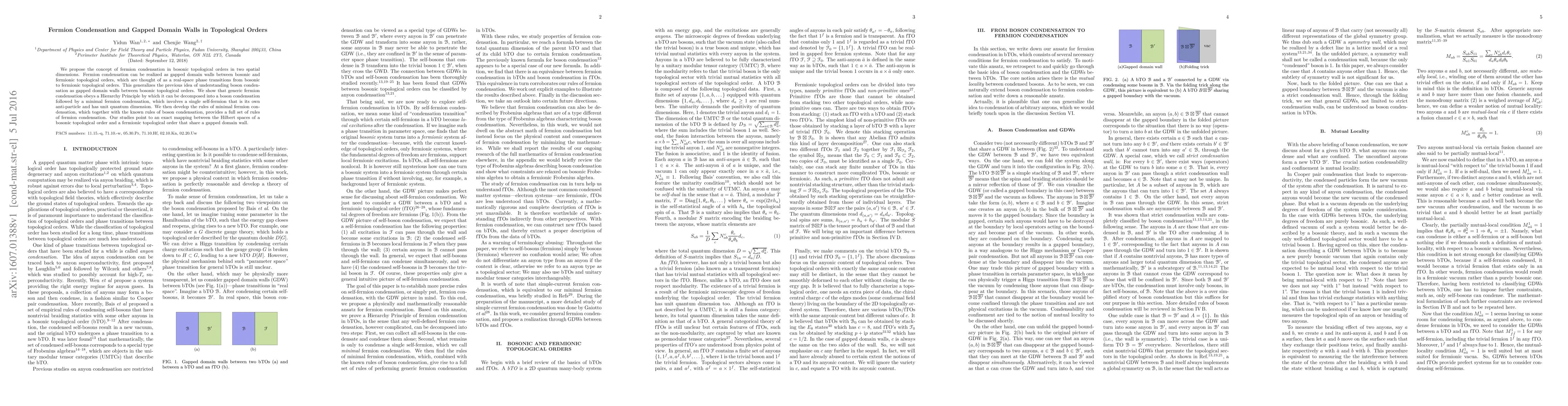 This paper introduces the concept of fermion condensation in two-dimensional bosonic topological orders, demonstrating it as gapped domain walls between bosonic and fermionic orders. It establishes a Hierarchy Principle for fermion condensation and provides rules for minimal fermion condensation, revealing an exact mapping between the Hilbert spaces of shared topological orders.