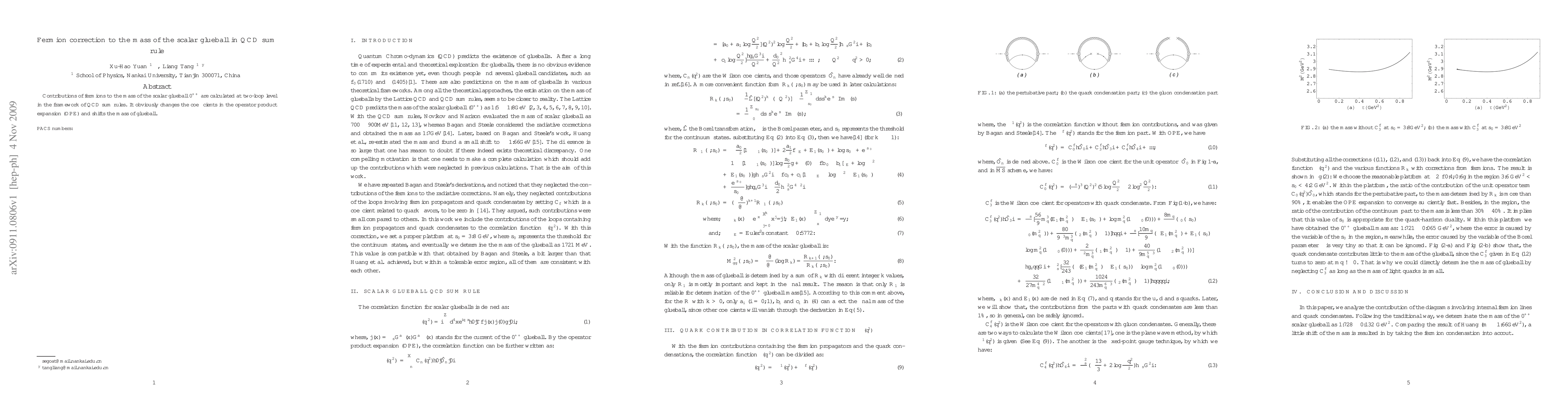 Summary: This paper calculates fermion contributions to the mass of the scalar glueball $0^{++}$ at the two-loop level within QCD sum rules, revealing changes in the operator product expansion coefficients and a shift in the glueball mass.