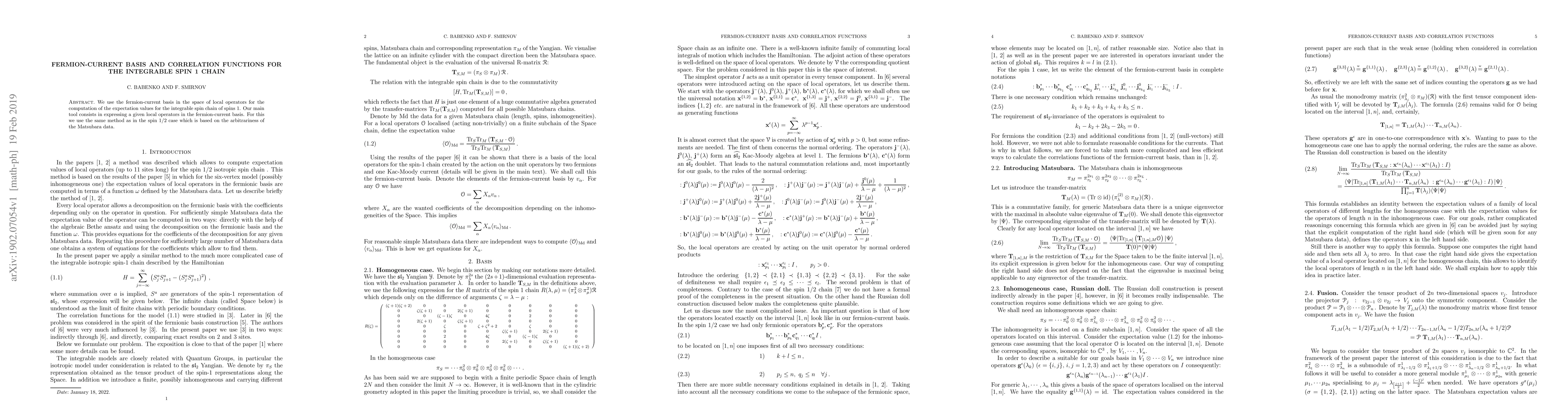 We use the fermion-current basis in the space of local operators for the computation of the expectation values for the integrable spin chain of spins 1. Our main tool consists in expressing a given local operators in the fermion-current basis. For this we use the same method as in the spin 1/2 case which is based on the arbitrariness of the Matsubara data.