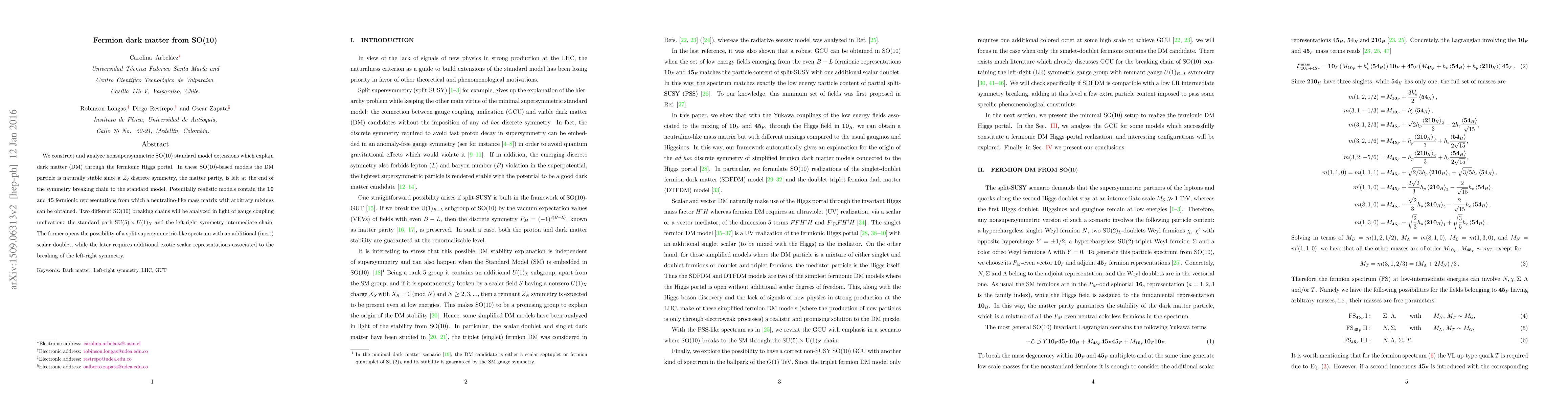 We construct and analyze nonsupersymmetric SO(10) standard model extensions which explain dark matter (DM) through the fermionic Higgs portal. In these SO(10)-based models the DM particle is naturally stable since a $Z_2$ discrete symmetry, the matter parity, is left at the end of the symmetry breaking chain to the standard model. Potentially realistic models contain the $\bf{10}$ and $\bf{45}$ fermionic representations from which a neutralino-like mass matrix with arbitrary mixings can be obtained. Two different SO(10) breaking chains will be analyzed in light of gauge coupling unification: the standard path $\text{SU}(5)\times U(1)_{X}$ and the left-right symmetry intermediate chain. The former opens the possibility of a split supersymmetric-like spectrum with an additional (inert) scalar doublet, while the later requires additional exotic scalar representations associated to the breaking of the left-right symmetry.