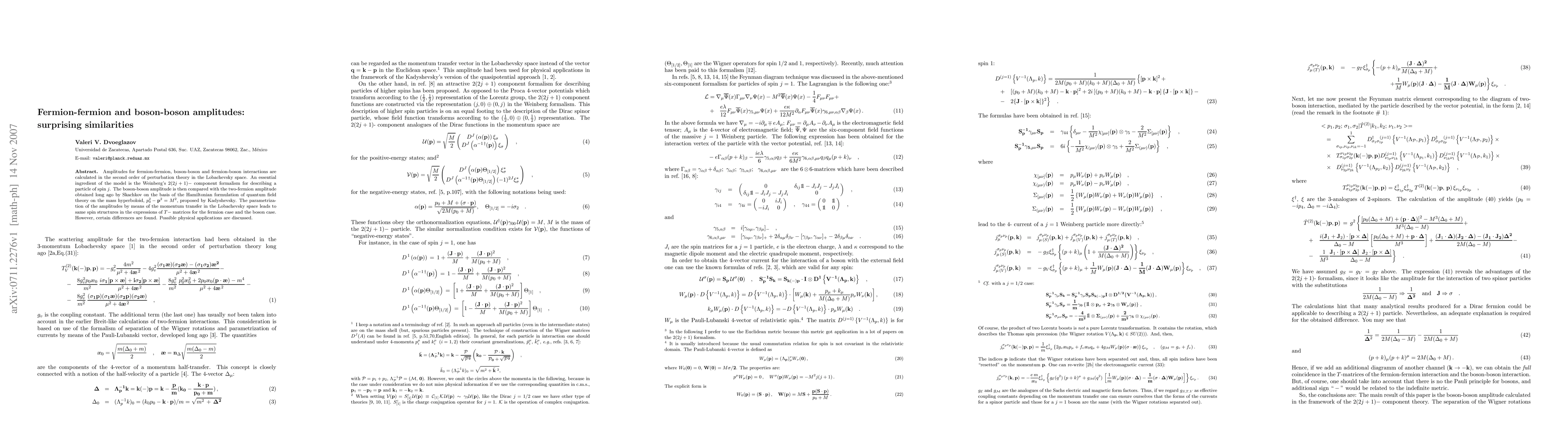 Amplitudes for fermion-fermion, boson-boson and fermion-boson interactions are calculated in the second order of perturbation theory in the Lobachevsky space. An essential ingredient of the model is the Weinberg's 2(2j+1)-component formalism for describing a particle of spin j. The boson-boson amplitude is then compared with the two-fermion amplitude obtained long ago by Skachkov on the basis of the Hamiltonian formulation of quantum field theory on the mass hyperboloid, p_0^2 - p^2=M^2, proposed by Kadyshevsky. The parametrization of the amplitudes by means of the momentum transfer in the Lobachevsky space leads to same spin structures in the expressions of T-matrices for the fermion case and the boson case. However, certain differences are found. Possible physical applications are discussed.