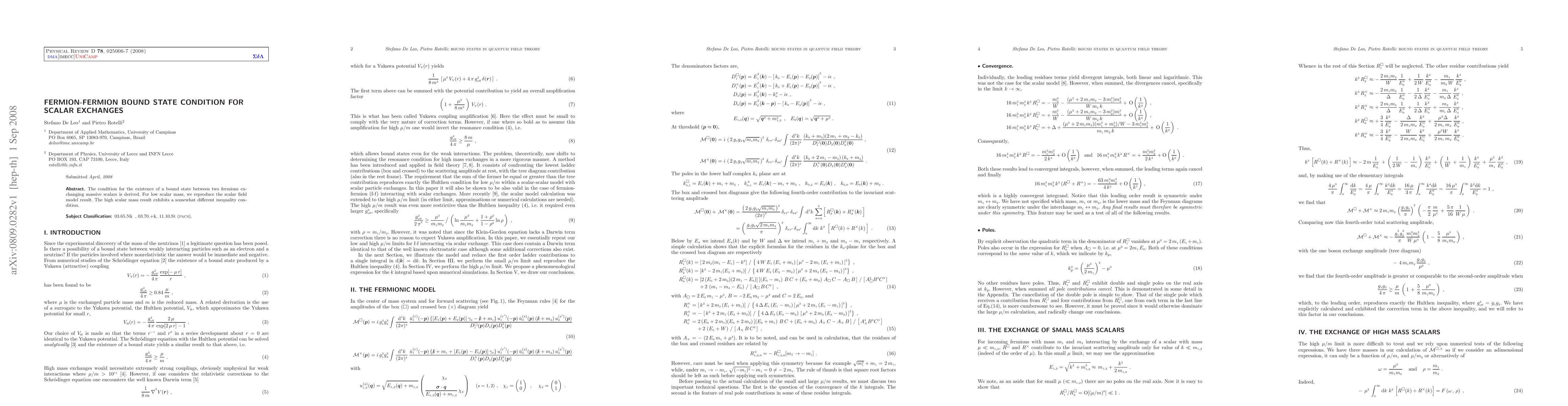 The condition for the existence of a bound state between two fermions exchanging massive scalars is derived. For low scalar mass, we reproduce the scalar field model result. The high scalar mass result exhibits a somewhat different inequality condition.