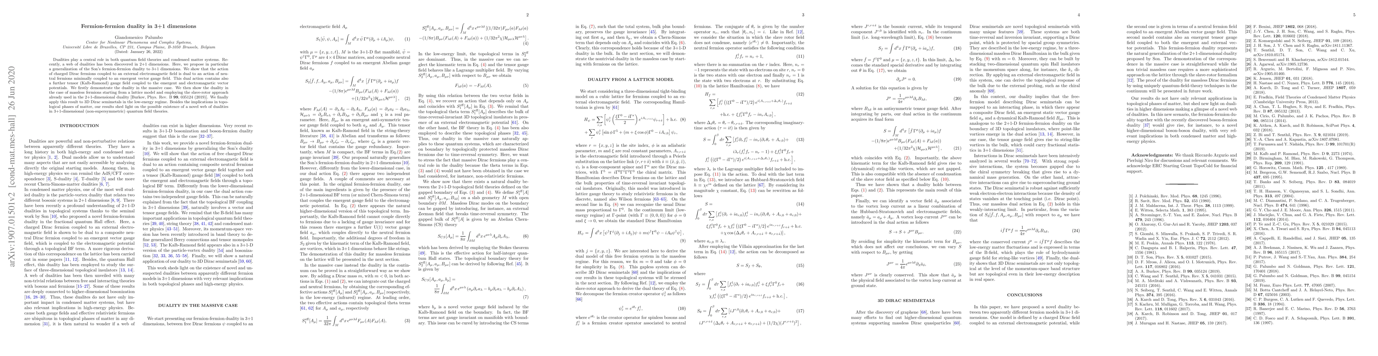Dualities play a central role in both quantum field theories and condensed matter systems. Recently, a web of dualities has been discovered in 2+1 dimensions. Here, we propose in particular a generalization of the Son's fermion-fermion duality to 3+1 dimensions. We show that the action of charged Dirac fermions coupled to an external electromagnetic field is dual to an action of neutral fermions minimally coupled to an emergent vector gauge field. This dual action contains also a further tensor (Kalb-Ramond) gauge field coupled to the emergent and electromagnetic vector potentials. We firstly demonstrate the duality in the massive case. We then show the duality in the case of massless fermions starting from a lattice model and employing the slave-rotor approach already used in the 2+1-dimensional duality [Burkov, Phys. Rev. B 99, 035124 (2019)]. We finally apply this result to 3D Dirac semimetals in the low-energy regime. Besides the implications in topological phases of matter, our results shed light on the possible existence of a novel web of dualities in 3+1-dimensional (non-supersymmetric) quantum field theories.