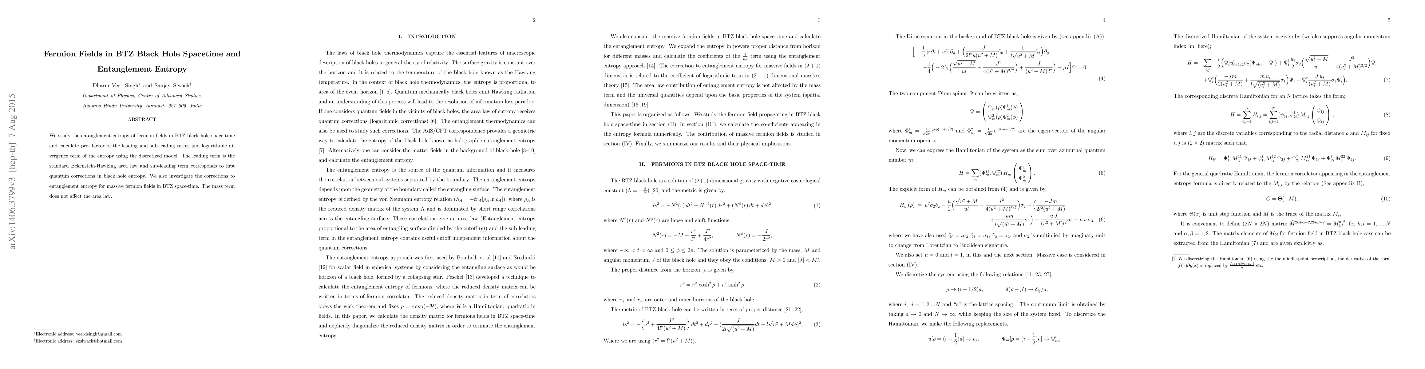 This study examines the entanglement entropy of fermion fields in BTZ black hole space-time, revealing the leading area law and first quantum corrections. The mass term for fermions does not alter the area law, only influencing sub-leading terms.