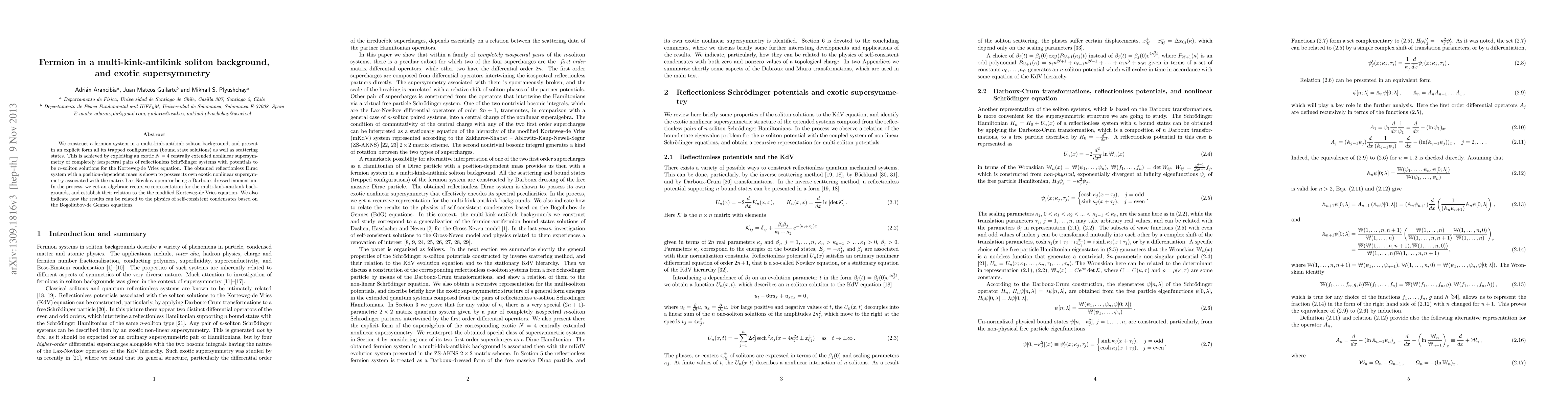 This paper constructs a fermion system in a multi-kink-antikink soliton background, revealing its bound and scattering states. It leverages an exotic N=4 nonlinear supersymmetry to achieve this, linking the results to the modified Korteweg-de Vries equation and self-consistent condensates.