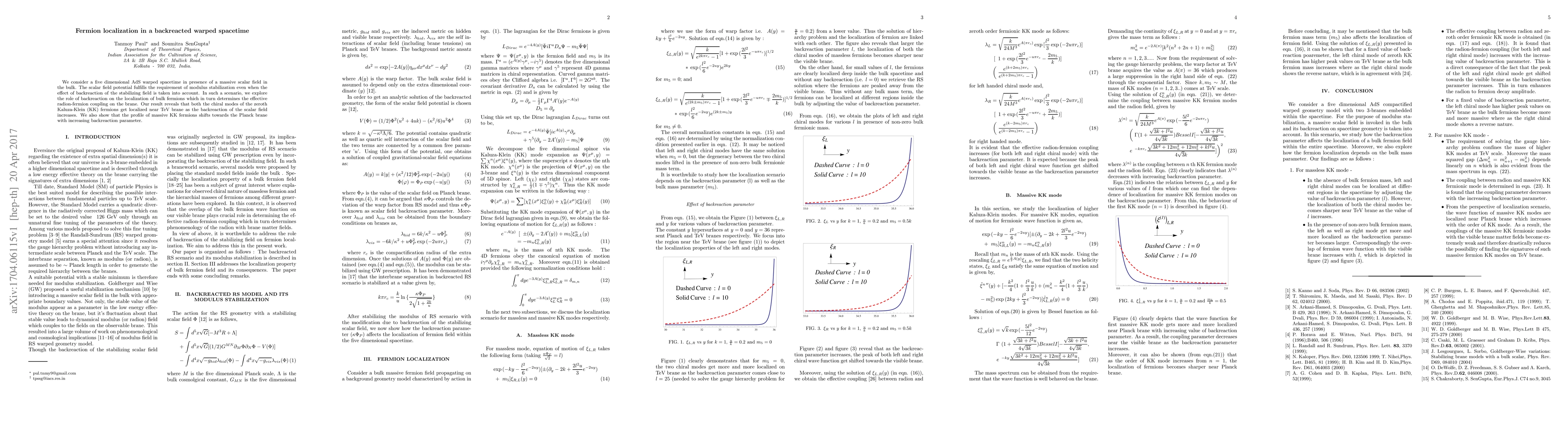 This paper investigates the localization of fermions in a five-dimensional AdS spacetime with a stabilized modulus due to a massive scalar field, considering the effects of backreaction. It finds that the chiral modes of zeroth Kaluza-Klein fermions localize near the TeV brane as backreaction increases, while massive KK fermions shift towards the Planck brane.