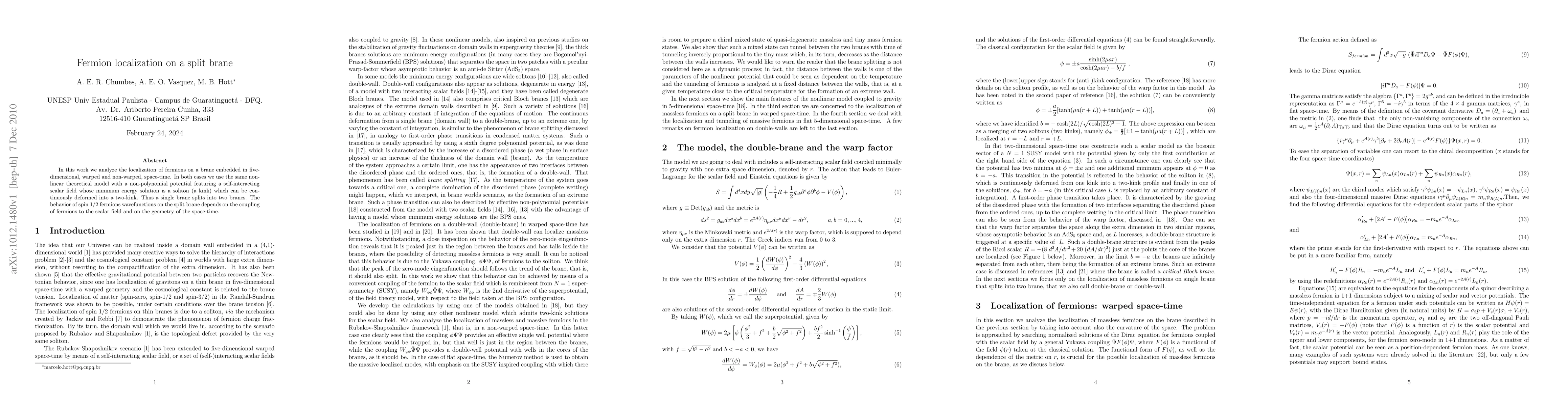 In this work we analyze the localization of fermions on a brane embedded in five-dimensional, warped and non-warped, space-time. In both cases we use the same nonlinear theoretical model with a non-polynomial potential featuring a self-interacting scalar field whose minimum energy solution is a soliton (a kink) which can be continuously deformed into a two-kink. Thus a single brane splits into two branes. The behavior of spin 1/2 fermions wavefunctions on the split brane depends on the coupling of fermions to the scalar field and on the geometry of the space-time.