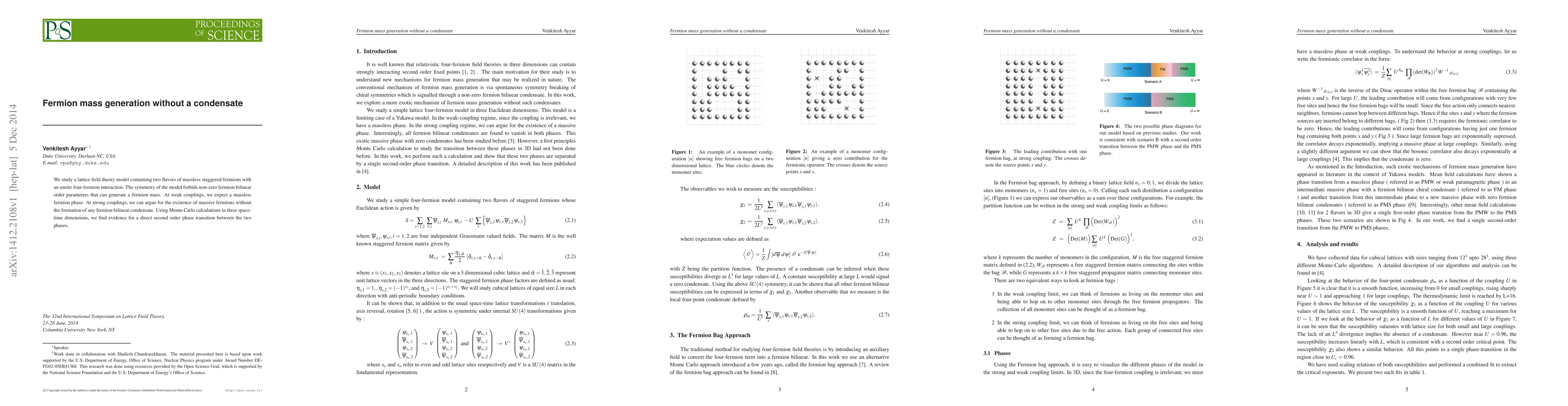 This research explores a fermion mass generation model without a condensate, using lattice field theory with massless staggered fermions and an onsite four-fermion interaction. Monte Carlo calculations in 3D suggest a direct second-order phase transition between massless and massive fermion phases at strong couplings, challenging the conventional understanding of fermion mass generation.