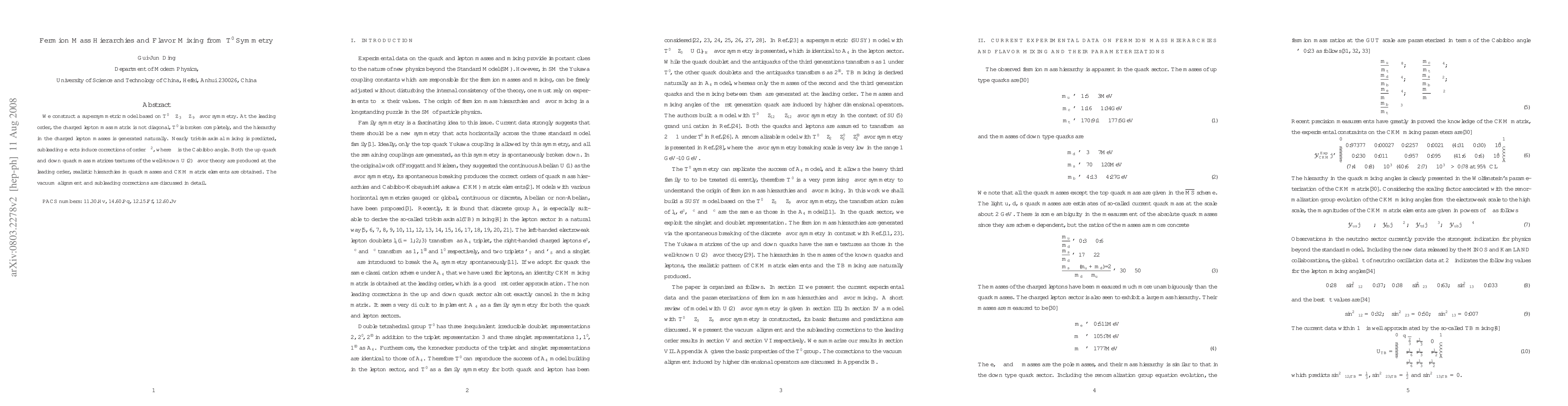 This paper proposes a supersymmetric model with $T'\otimes Z_3\otimes Z_9$ flavor symmetry to naturally generate fermion mass hierarchies and predict nearly tri-bimaximal flavor mixing, with corrections of order $\lambda^2$. It also achieves realistic quark mass hierarchies and CKM matrix elements, detailing vacuum alignment and subleading corrections.