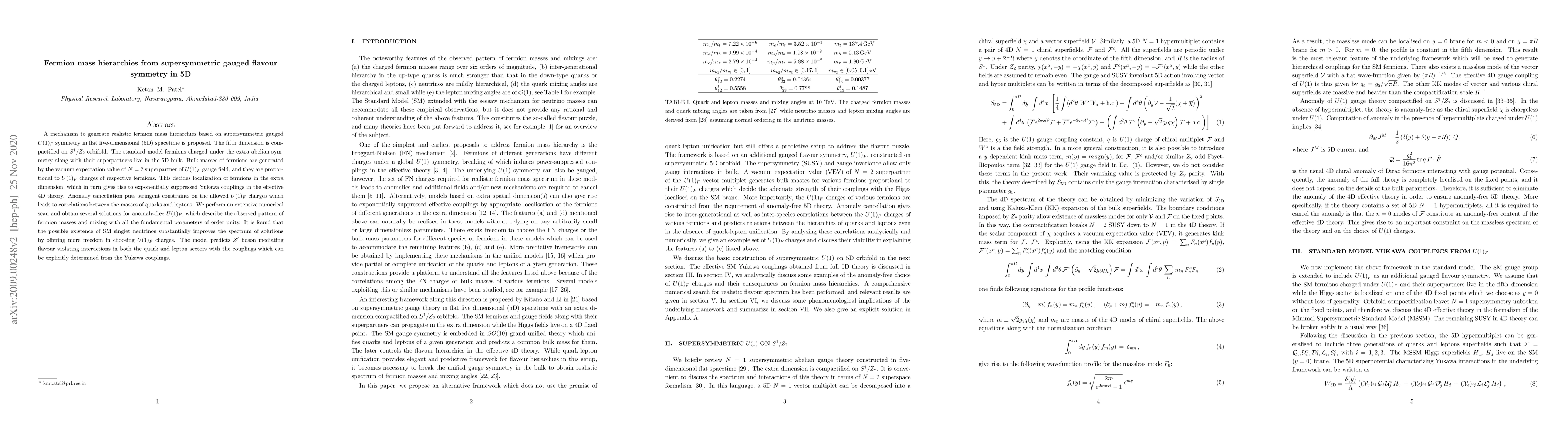 This paper proposes a mechanism for generating realistic fermion mass hierarchies using supersymmetric gauged $U(1)_F$ symmetry in 5D, with the fifth dimension compactified on $S^1/Z_2$. The model predicts $Z^\prime$ bosons mediating flavour-violating interactions and offers solutions correlating quark and lepton masses, improved by the inclusion of SM singlet neutrinos.