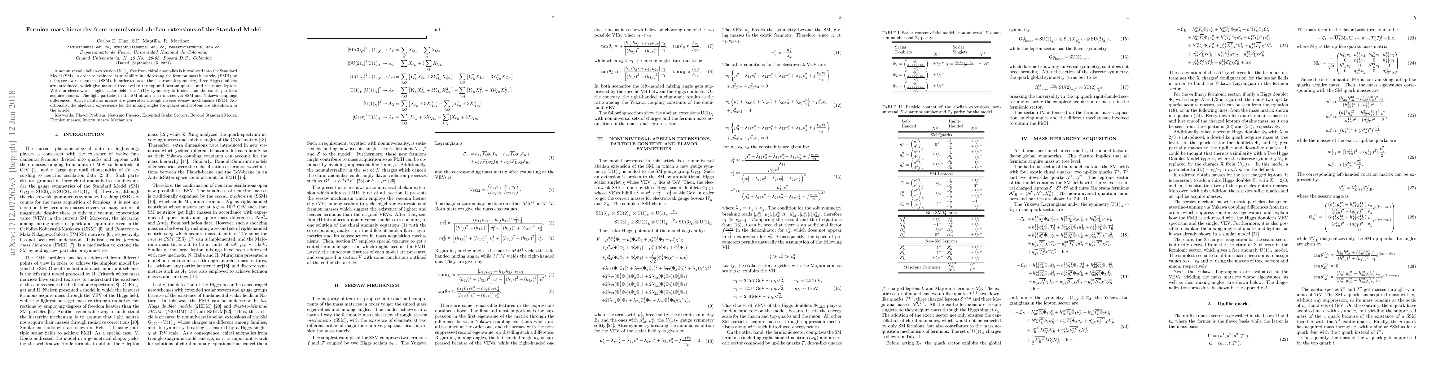 This paper introduces a nonuniversal abelian extension $\mathrm{U(1)}_{X}$ to the Standard Model to address the fermion mass hierarchy using seesaw mechanisms. It employs three Higgs doublets for tree-level mass generation and an electroweak singlet scalar to break the $U(1)_{X}$ symmetry, generating masses for exotic particles and light Standard Model particles via Yukawa couplings and the inverse seesaw mechanism for neutrinos.