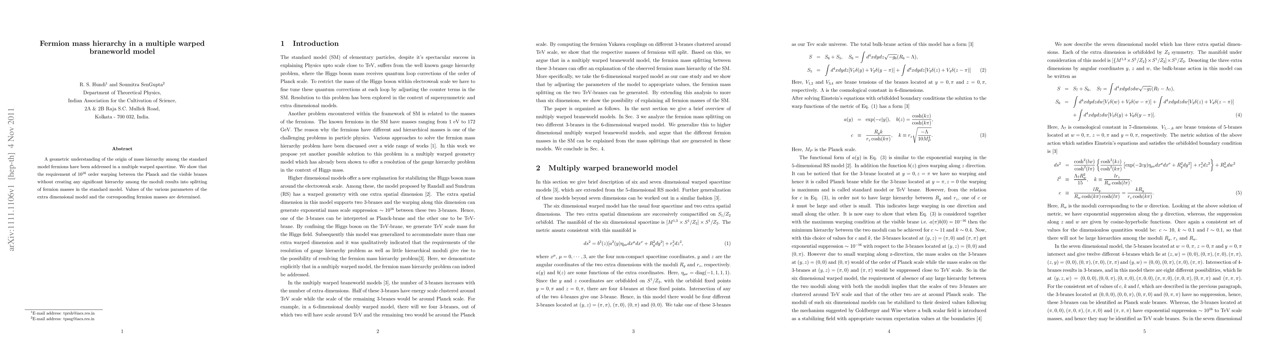 This paper explores the fermion mass hierarchy in a multiple warped braneworld model, demonstrating that a $10^{16}$ order warping between the Planck and visible branes can naturally explain the mass differences among standard model fermions without significant hierarchy in moduli. The model determines specific parameter values that correlate with observed fermion masses.