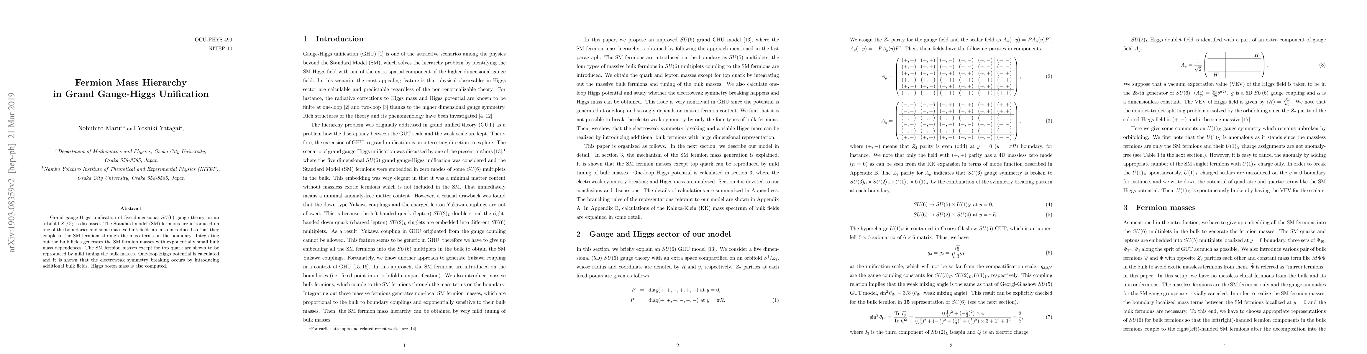 This paper explores a five-dimensional $SU(6)$ gauge theory on an orbifold to explain the fermion mass hierarchy in the Standard Model. By introducing SM fermions on a boundary and coupling them to massive bulk fields, it demonstrates how SM fermion masses, except for the top quark, can be reproduced with minimal tuning, and calculates the one-loop Higgs potential to achieve electroweak symmetry breaking.