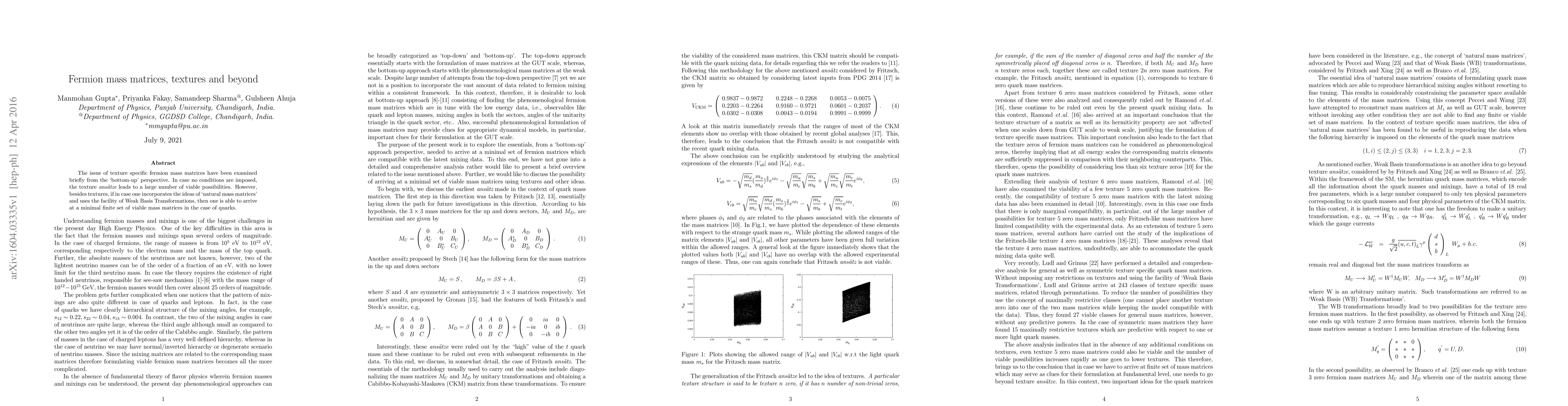 The issue of texture specific fermion mass matrices have been examined briefly from the `bottom-up' perspective. In case no conditions are imposed, the texture ansatze leads to a large number of viable possibilities. However, besides textures, if in case one incorporates the ideas of `natural mass matrices' and uses the facility of Weak Basis Transformations, then one is able to arrive at a minimal finite set of viable mass matrices in the case of quarks.