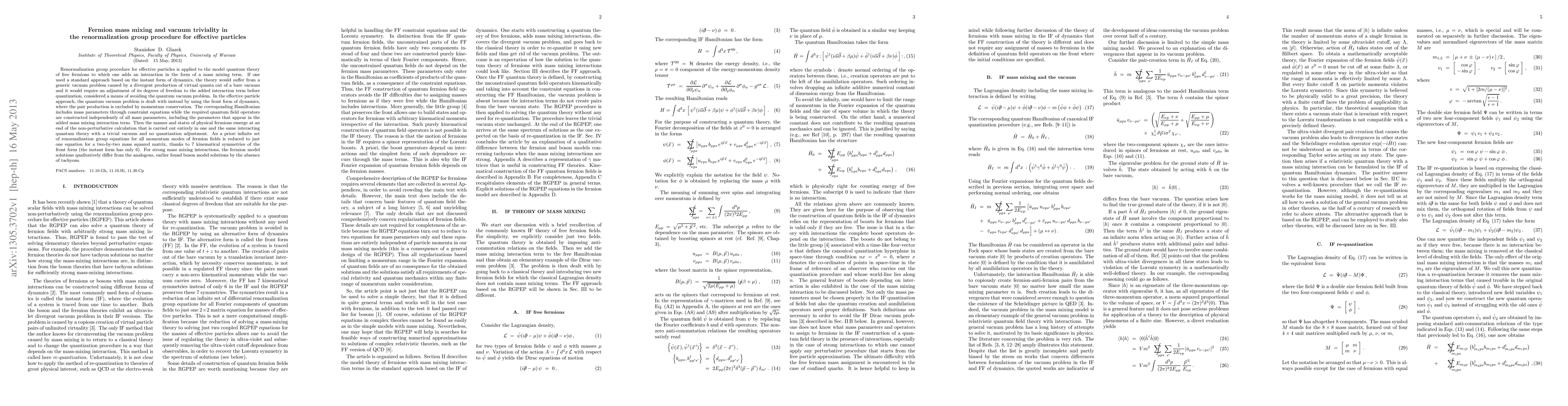 Renormalization group procedure for effective particles is applied to the model quantum theory of free fermions to which one adds an interaction in the form of a mass mixing term. If one used a standard approach based on the instant form of dynamics, the theory would suffer from a generic vacuum problem caused by a divergent production of virtual quanta out of a bare vacuum and it would require an adjustment of its degrees of freedom to the added interaction term before quantization, considered a means of avoiding the quantum vacuum problem. In the effective particle approach, the quantum vacuum problem is dealt with instead by using the front form of dynamics, where the pair production is excluded by momentum conservation. The corresponding Hamiltonian includes mass parameters through constraint equations while the required quantum field operators are constructed independently of all mass parameters, including the parameters that appear in the added mass mixing interaction term. Then the masses and states of physical fermions emerge at an end of the non-perturbative calculation that is carried out entirely in one and the same interacting quantum theory with a trivial vacuum and no quantization adjustment. An a priori infinite set of renormalization group equations for all momentum modes of fermion fields is reduced to just one equation for a two-by-two mass squared matrix, thanks to 7 kinematical symmetries of the front form (the instant form has only 6). For strong mass mixing interactions, the fermion model solutions qualitatively differ from the analogous, earlier found boson model solutions by the absence of tachyons.