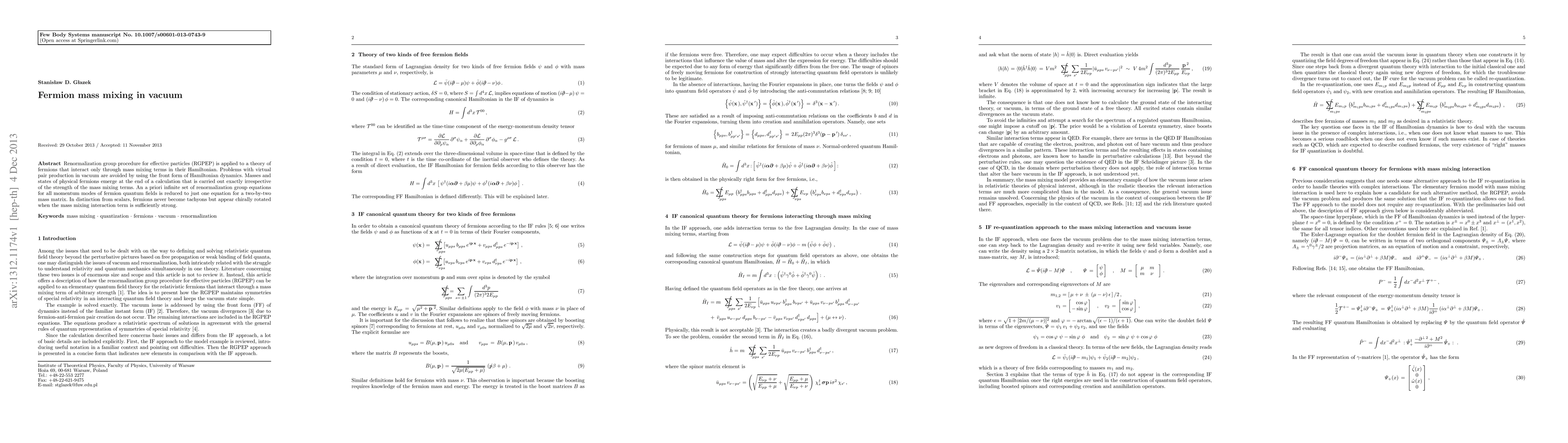 Renormalization group procedure for effective particles (RGPEP) is applied to a theory of fermions that interact only through mass mixing terms in their Hamiltonian. Problems with virtual pair production in vacuum are avoided by using the front form of Hamiltonian dynamics. Masses and states of physical fermions emerge at the end of a calculation that is carried out exactly irrespective of the strength of the mass mixing terms. An a priori infinite set of renormalization group equations for all momentum modes of fermion quantum fields is reduced to just one equation for a two-by-two mass matrix. In distinction from scalars, fermions never become tachyons but appear chirally rotated when the mass mixing interaction term is sufficiently strong.