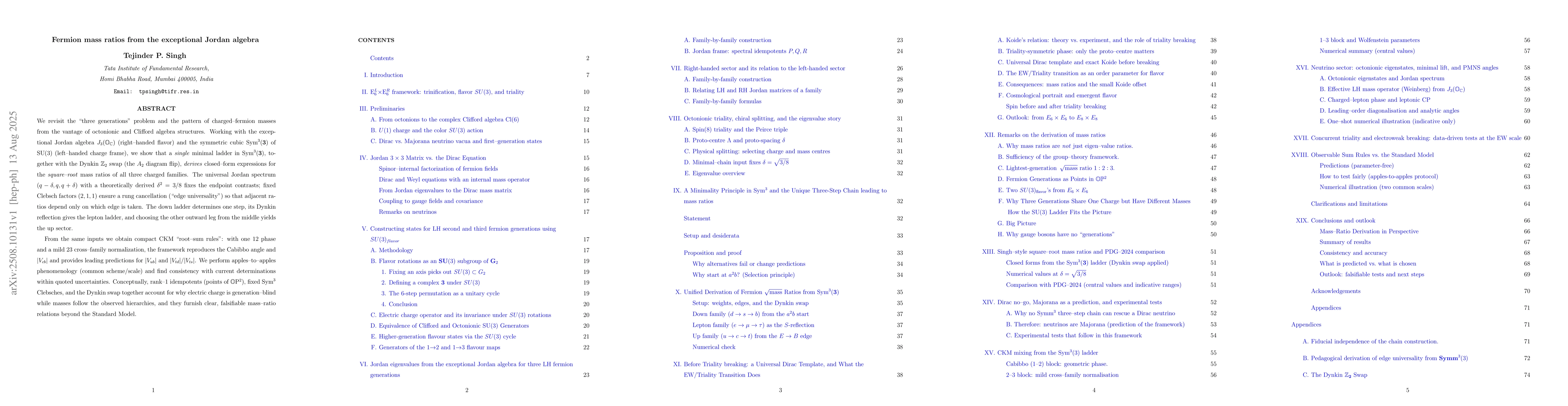 We revisit the "three generations" problem and the pattern of charged-fermion masses from the vantage of octonionic and Clifford algebra structures. Working with the exceptional Jordan algebra J3(OC) (right-handed flavor) and the symmetric cube of SU(3) (left-handed charge frame), we show that a single minimal ladder in the symmetric cube, together with the Dynkin Z2 swap (the A2 diagram flip), leads to closed-form expressions for the square-root mass ratios of all three charged families. The universal Jordan spectrum (q - delta, q, q + delta) with a theoretically derived delta squared = 3/8 fixes the endpoint contrasts; fixed Clebsch factors (2, 1, 1) ensure rung cancellation ("edge universality") so that adjacent ratios depend only on which edge is taken. The down ladder determines one step, its Dynkin reflection gives the lepton ladder, and choosing the other outward leg from the middle yields the up sector. From the same inputs we obtain compact CKM "root-sum rules": with one 1-2 phase and a mild 2-3 cross-family normalization, the framework reproduces the Cabibbo angle and Vcb and provides leading predictions for Vub and Vtd/Vts. We perform apples-to-apples phenomenology (common scheme/scale) and find consistency with current determinations within quoted uncertainties. Conceptually, rank-1 idempotents (points of the octonionic projective plane), fixed symmetric-cube Clebsches, and the Dynkin swap together account for why electric charge is generation-blind while masses follow the observed hierarchies, and they furnish clear, falsifiable mass-ratio relations beyond the Standard Model.