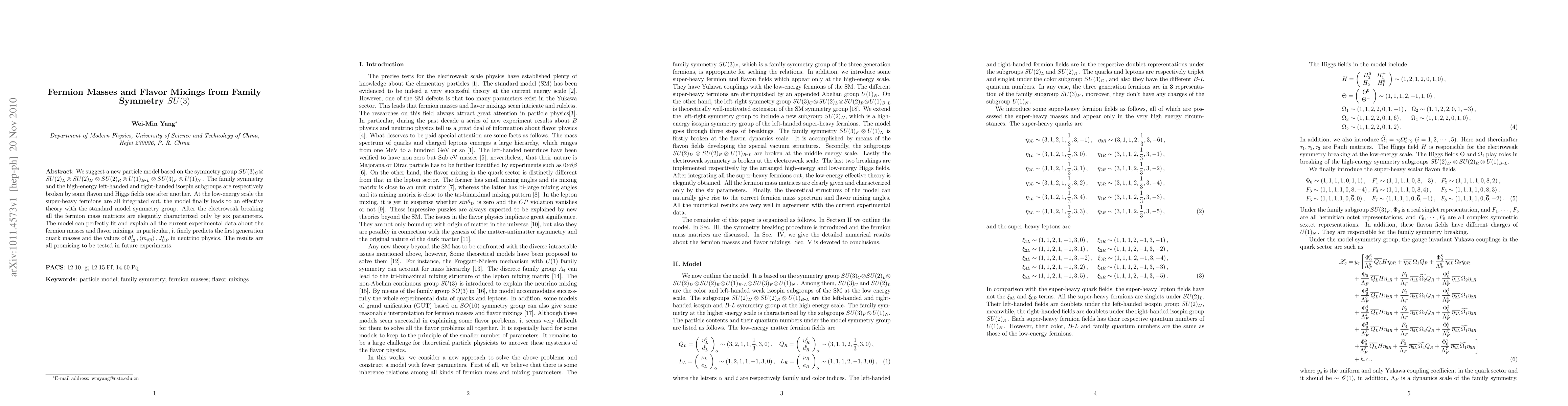This paper proposes a new particle model based on the symmetry group $SU(3)_{F}$ and various other subgroups, where family symmetry and isospin subgroups are broken sequentially. The model elegantly characterizes fermion masses and flavor mixings with six parameters, fitting current experimental data and predicting first-generation quark masses and neutrino physics parameters precisely.