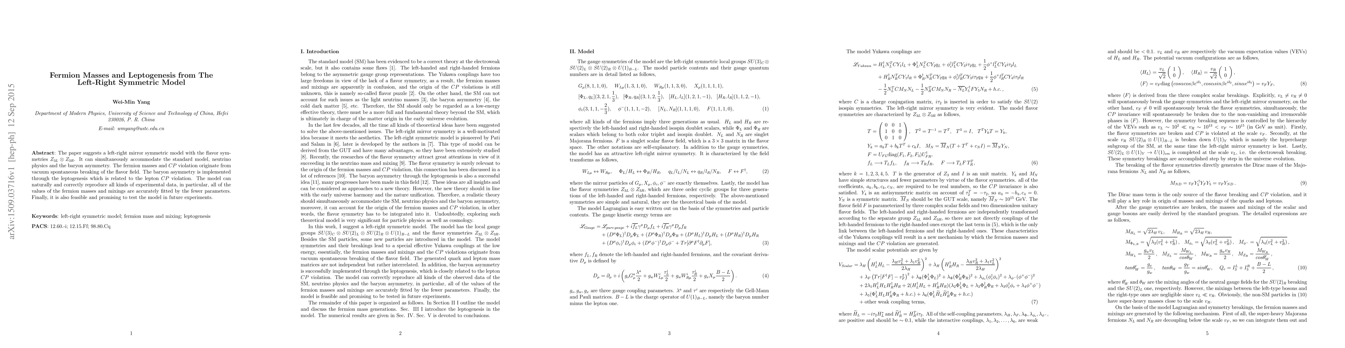The paper suggests a left-right mirror symmetric model with the flavor symmetries $Z_{3L}\otimes Z_{3R}$. It can simultaneously accommodate the standard model, neutrino physics and the baryon asymmetry. The fermion masses and $CP$ violation originate from vacuum spontaneous breaking of the flavor field. The baryon asymmetry is implemented through the leptogenesis which is related to the lepton $CP$ violation. The model can naturally and correctly reproduce all kinds of experimental data, in particular, all of the values of the fermion masses and mixings are accurately fitted by the fewer parameters. Finally, it is also feasible and promising to test the model in future experiments.