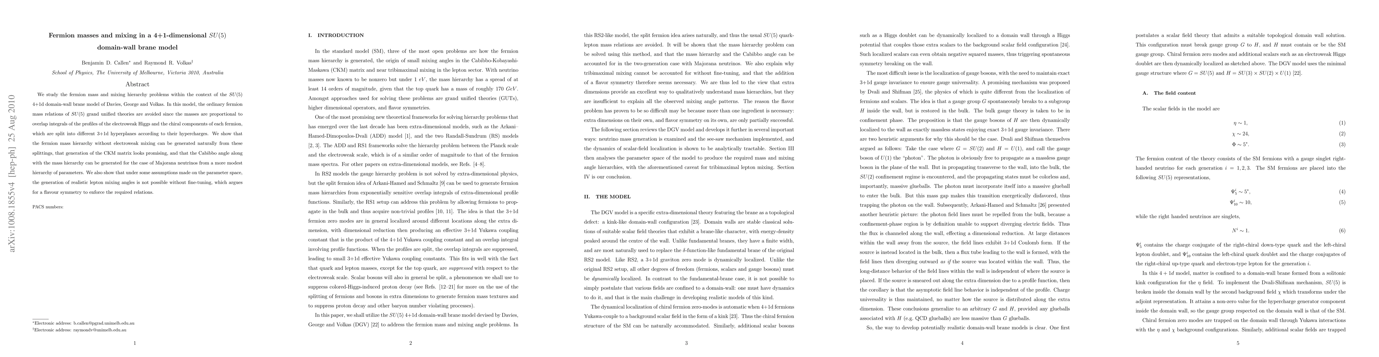 This paper explores fermion mass and mixing in a 4+1-dimensional SU(5) domain-wall brane model, demonstrating how mass hierarchies arise naturally without electroweak mixing due to fermion profile overlaps. It suggests promising generation of the CKM matrix and Cabibbo angle for Majorana neutrinos, but notes that realistic lepton mixing requires fine-tuning or a flavor symmetry.