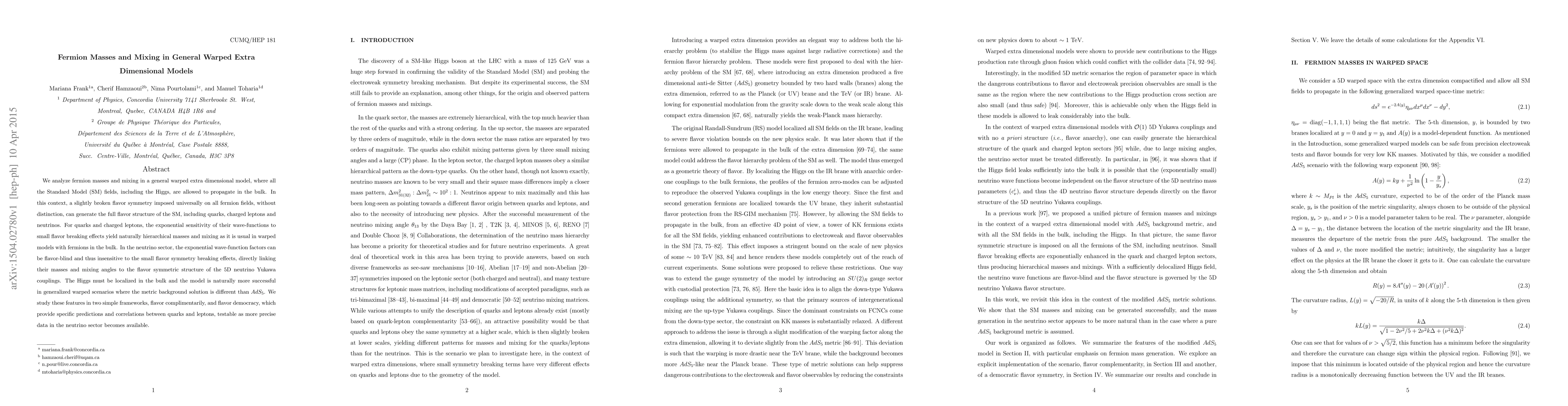 This paper explores fermion masses and mixing in general warped extra-dimensional models where all SM fields propagate in the bulk, proposing a slightly broken flavor symmetry to generate the SM's flavor structure. The model naturally explains hierarchical quark and charged lepton masses and mixing, while neutrino masses and mixing are linked to the flavor symmetric structure of 5D neutrino Yukawa couplings.