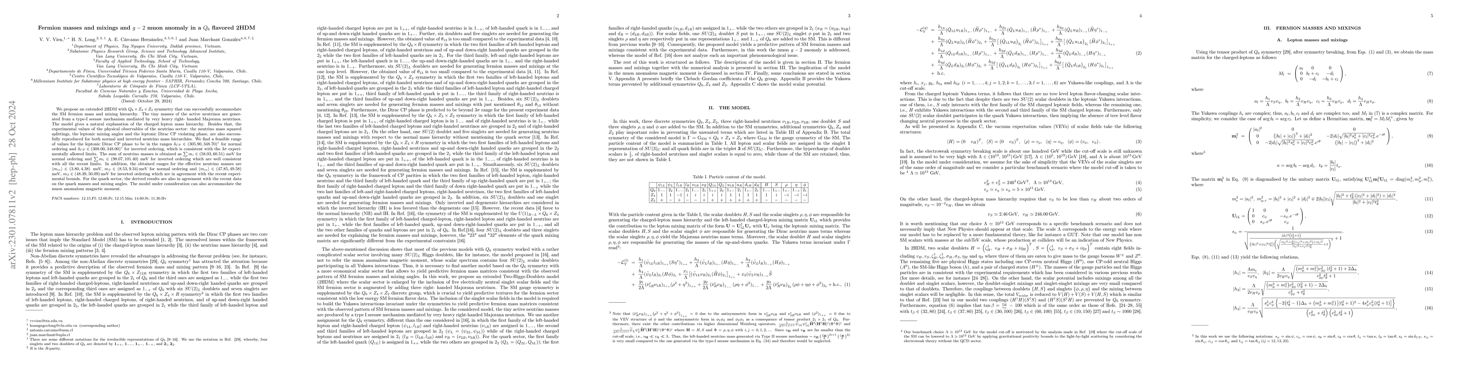 We propose an extended 2HDM with $Q_6\times Z_4\times Z_2$ symmetry that can interpret the SM fermion mass hierarchy and their mixing patterns with the Dirac CP phase in the framework of the type-I seesaw mechanism. The smallness of neutrino masses is obtained via the Type-I seesaw mechanism. Both normal and inverted neutrino mass hierarchies are consistent with the experimental data on the lepton and quark masses and mixing patterns. The prediction for the Dirac phase is $\delta_{CP}\in (1.50, 1.82)\pi$ for normal ordering and $\delta_{CP}\in (1.50, 1.80)\pi$ for inverted ordering that includes its experimentally maximum value. The sum of neutrino masses is predicted to be $\sum m_i \in (58.50, 60.50)$\, meV for normal ordering and $\sum m_i\in (98.50, 101.00)\, $ \, meV for inverted ordering which are well consistent with all the recent limits. In addition, the predictions for the effective neutrino masses are $\langle m_{ee}\rangle \in (3.70, 3.90)$\, meV for normal ordering and $\langle m_{ee}\rangle \in (48.00, 49.40)$\, meV for inverted ordering which are in consistence with the recent experimental bounds. For the quark sector, the derived results are also in agreement with the recent data on the quark masses and mixing angles. The considered model can also accommodate the muon anomalous magnetic moment and the mesons oscillation in accordance with the experiment data.
