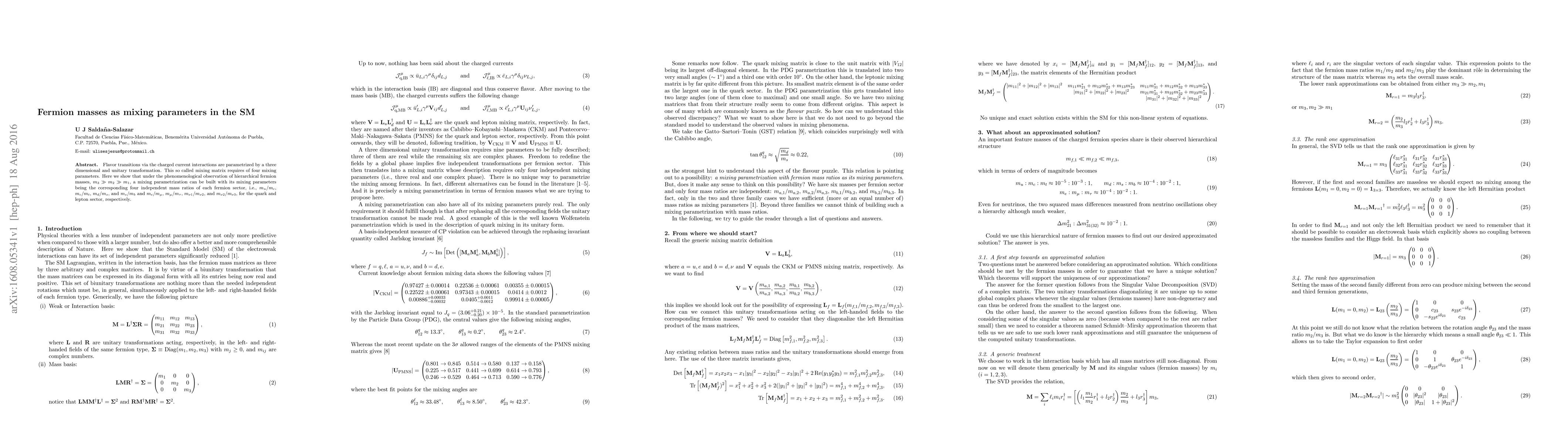 This paper explores a novel parametrization of the Standard Model's mixing matrix using fermion mass ratios, demonstrating that hierarchical fermion masses allow for four mixing parameters corresponding to the ratios of quark and lepton masses. This approach simplifies the parameterization of flavor transitions in charged current interactions.