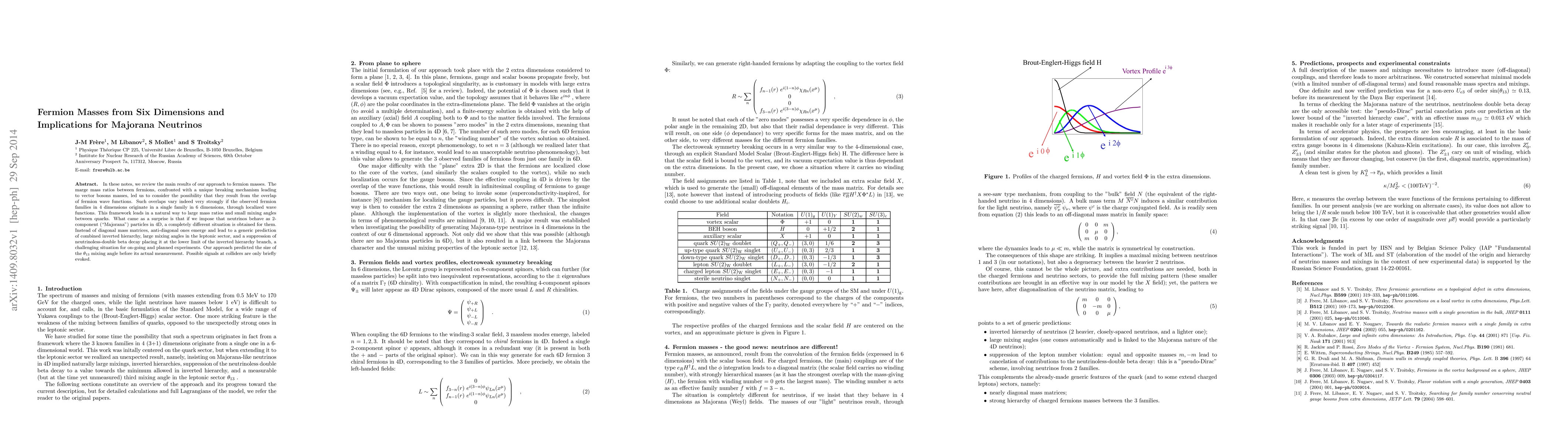 In these notes, we review the main results of our approach to fermion masses. The marge mass ratios between fermions, confronted with a unique breaking mechanism leading to vector bosons masses, led us to consider the possibility that they result from the overlap of fermion wave functions. Such overlaps vary indeed very strongly if the observed fermion families in 4 dimensions originate in a single family in 6 dimensions, through localized wave functions. This framework leads in a natural way to large mass ratios and small mixing angles between quarks. What came as a surprise is that if we impose that neutrinos behave as 2-component ("Majorana") particles in 4D, a completely different situation is obtained for them. Instead of diagonal mass matrices, anti-diagonal ones emerge and lead to a generic prediction of combined inverted hierarchy, large mixing angles in the leptonic sector, and a suppression of neutrinoless-double beta decay placing it at the lower limit of the inverted hierarchy branch, a challenging situation for on-going and planned experiments. Our approach predicted the size of the $\theta_{13}$ mixing angle before its actual measurement. Possible signals at colliders are only briefly evoked.