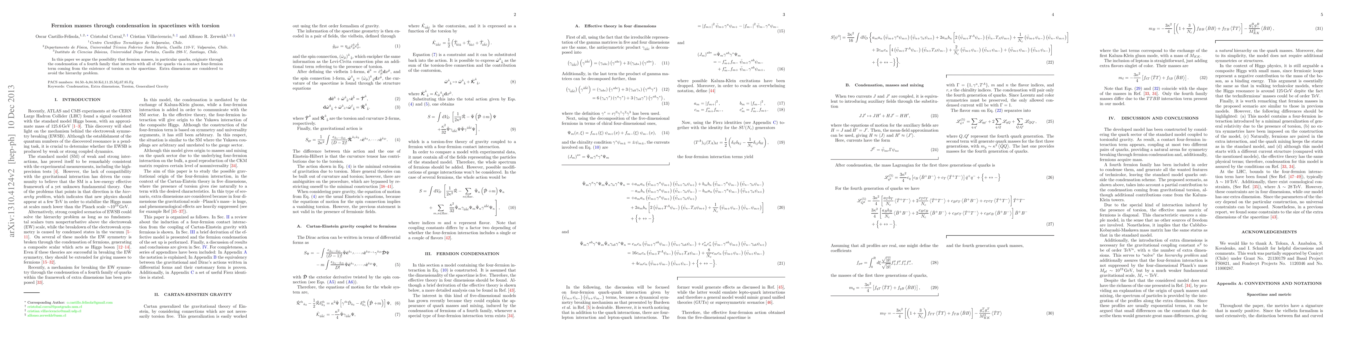 This paper explores the origin of fermion masses, specifically quarks, through the condensation of a fourth family of fermions interacting via a four-fermion term, influenced by spacetime torsion, with extra dimensions proposed to resolve the hierarchy problem.