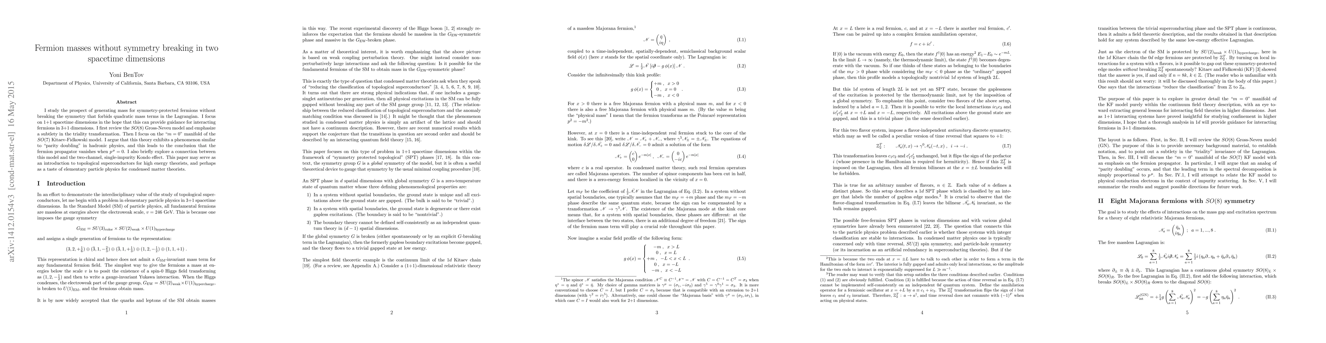 I study the prospect of generating mass for symmetry-protected fermions without breaking the symmetry that forbids quadratic mass terms in the Lagrangian. I focus on 1+1 spacetime dimensions in the hope that this can provide guidance for interacting fermions in 3+1 dimensions. I first review the SO(8) Gross-Neveu model and emphasize a subtlety in the triality transformation. Then I focus on the "m = 0" manifold of the SO(7) Kitaev-Fidkowski model. I argue that this theory exhibits a phenomenon similar to "parity doubling" in hadronic physics, and this leads to the conclusion that the fermion propagator vanishes when p = 0. I also briefly explore a connection between this model and the two-channel, single-impurity Kondo effect. This paper may serve as an introduction to topological superconductors for high energy theorists, and perhaps as a taste of elementary particle physics for condensed matter theorists.