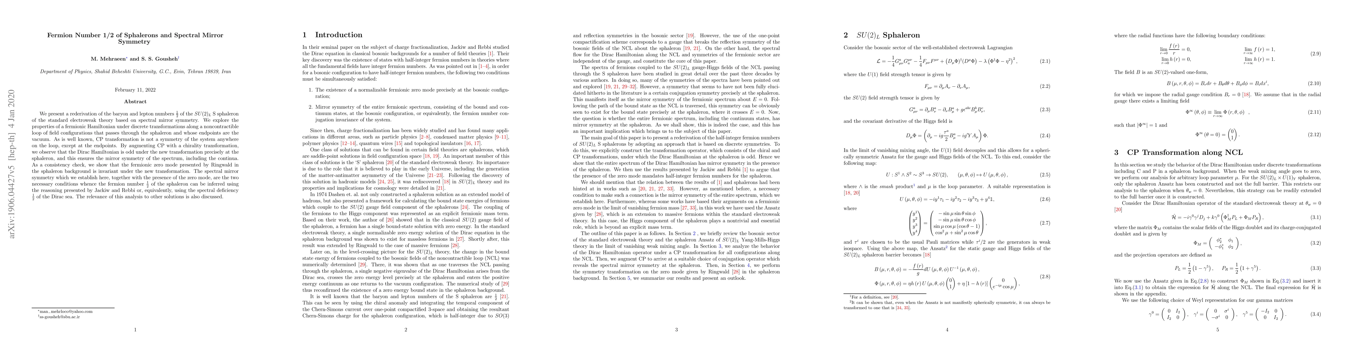 This paper rederives the $\frac{1}{2}$ fermion number of the $SU(2)_L$ electroweak sphaleron using spectral mirror symmetry, showing that the Dirac Hamiltonian is odd under a combined chirality and CP transformation at the sphaleron. The analysis confirms the presence of a fermionic zero mode invariant under this transformation, supporting the $\frac{1}{2}$ fermion number inference.