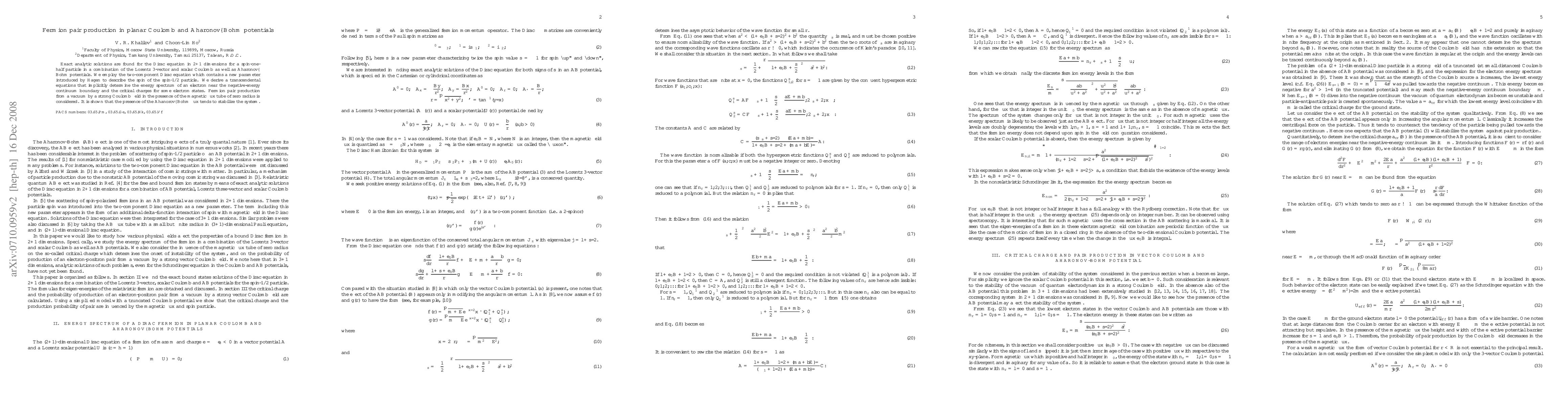 This paper finds exact analytic solutions for the Dirac equation in 2+1 dimensions under combined Coulomb and Aharonov-Bohm potentials, revealing the energy spectrum and critical charges for electron states. It also explores fermion pair production in strong Coulomb fields with a magnetic flux tube, demonstrating that the Aharonov-Bohm effect stabilizes the system.
