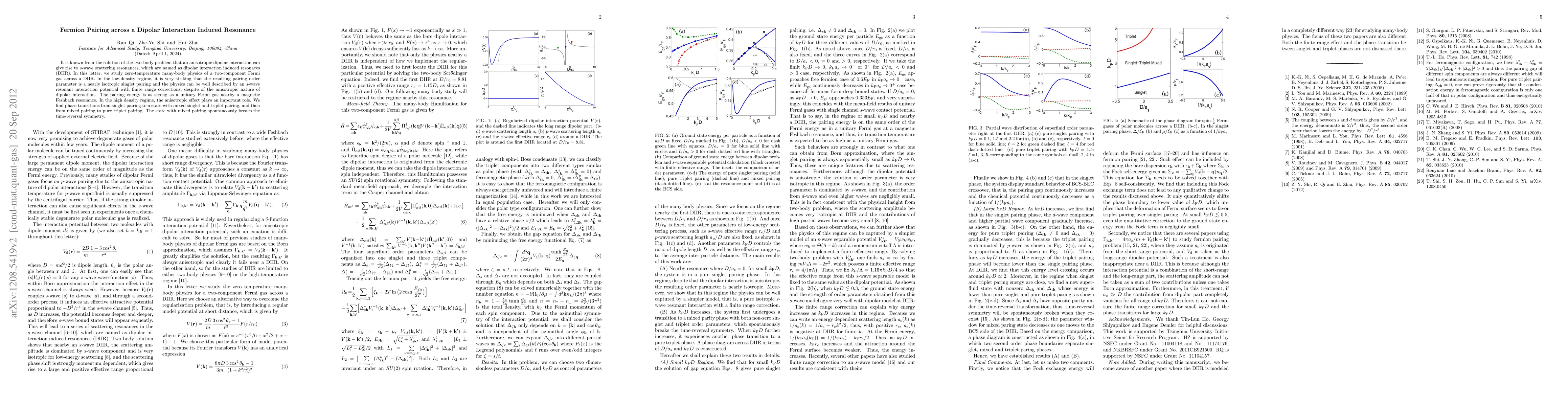 This paper investigates the many-body physics of a two-component Fermi gas under dipolar interaction induced resonances (DIIR), revealing nearly isotropic singlet pairing at low densities and phase transitions to mixed and triplet pairing at high densities, with spontaneous time-reversal symmetry breaking in the mixed pairing state.