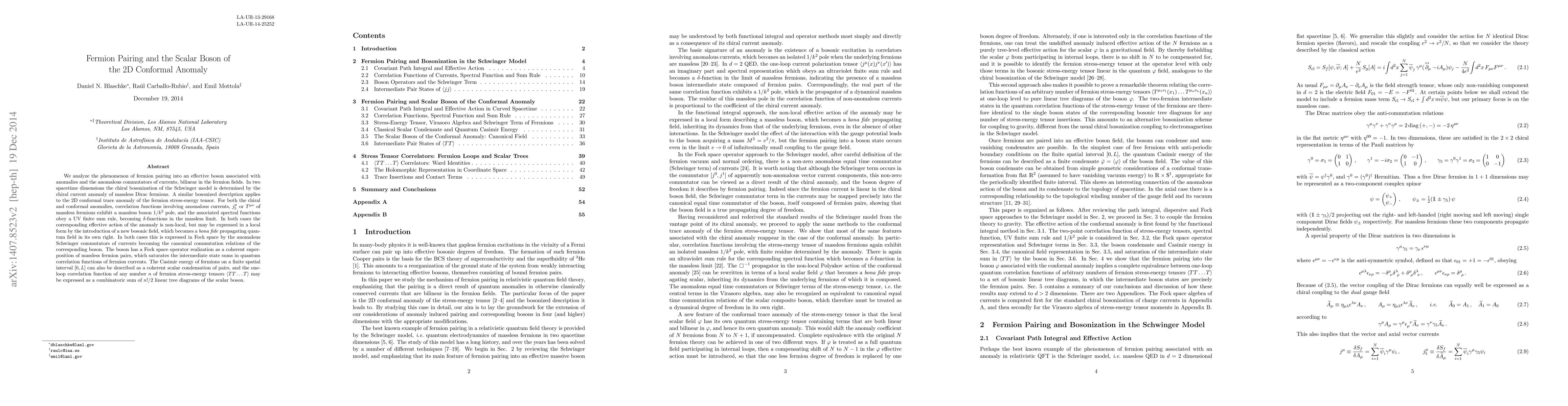 We analyze the phenomenon of fermion pairing into an effective boson associated with anomalies and the anomalous commutators of currents bilinear in the fermion fields. In two spacetime dimensions the chiral bosonization of the Schwinger model is determined by the axial current anomaly of massless Dirac fermions. A similar bosonized description applies to the 2D conformal trace anomaly of the fermion stress tensor. For both the chiral and conformal anomalies, correlation functions involving anomalous currents, $j^{\mu}_5$ or $T^{\mu\nu}$ of massless fermions exhibit a massless boson $1/k^2$ pole, and the associated spectral functions obey a UV finite sum rule, becoming $\delta$-functions in the massless limit. In both cases the corresponding effective action of the anomaly is non-local, but may be expressed in a local form by the introduction of a new bosonic field, which becomes a bona fide propagating quantum field in its own right. In both cases this is expressed in Fock space by the anomalous Schwinger commutators of currents becoming the canonical commutation relations of the corresponding boson. The boson has a Fock space operator realization as a coherent superposition of massless fermion pairs, which saturates the intermediate state sums in quantum correlation functions of fermion currents. The Casimir energy of fermions on a finite spatial interval $[0,L]$ can also be described as a coherent scalar condensation of pairs, and the one-loop correlation function of any number $n$ of fermion stress tensors $\langle TT\dots T\rangle$ may be expressed as a combinatoric sum of $n!/2$ linear tree diagrams of the scalar boson.