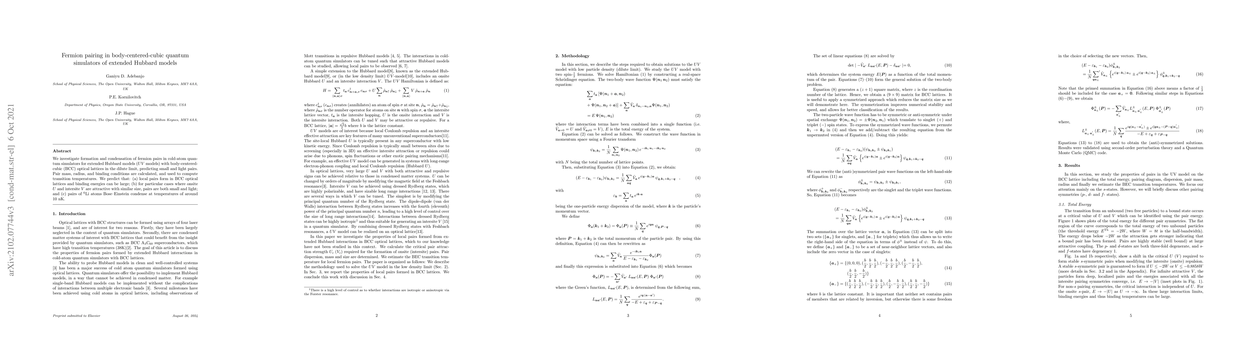 We investigate formation and condensation of fermion pairs in cold-atom quantum simulators for extended Hubbard models ($UV$ models) with body-centered-cubic (BCC) optical lattices in the dilute limit, predicting small and light pairs. Pair mass, radius, and binding conditions are calculated, and used to compute transition temperatures. We predict that: (a) local pairs form in BCC optical lattices and binding energies can be large; (b) for particular cases where onsite $U$ and intersite $V$ are attractive with similar size, pairs are both small and light; and (c) pairs of $^6$Li atoms Bose--Einstein condense at temperatures of around 10 nK.