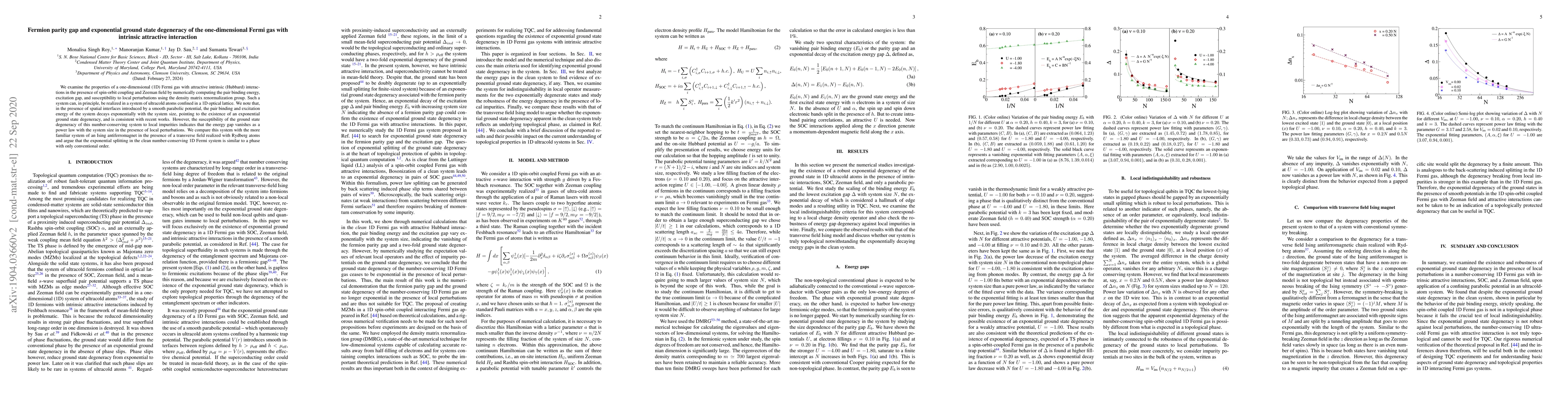 We examine the properties of a one-dimensional (1D) Fermi gas with attractive intrinsic (Hubbard) interactions in the presence of spin-orbit coupling and Zeeman field by numerically computing the pair binding energy, excitation gap, and susceptibility to local perturbations using the density matrix renormalization group. Such a system can, in principle, be realized in a system of ultracold atoms confined in a 1D optical lattice. We note that, in the presence of spatial interfaces introduced by a smooth parabolic potential, the pair binding and excitation energy of the system decays exponentially with the system size, pointing to the existence of an exponential ground state degeneracy, and is consistent with recent works. However, the susceptibility of the ground state degeneracy of this number-conserving system to local impurities indicates that the energy gap vanishes as a power law with the system size in the presence of local perturbations. We compare this system with the more familiar system of an Ising antiferromagnet in the presence of a transverse field realized with Rydberg atoms and argue that the exponential splitting in the clean number-conserving 1D Fermi system is similar to a phase with only conventional order.