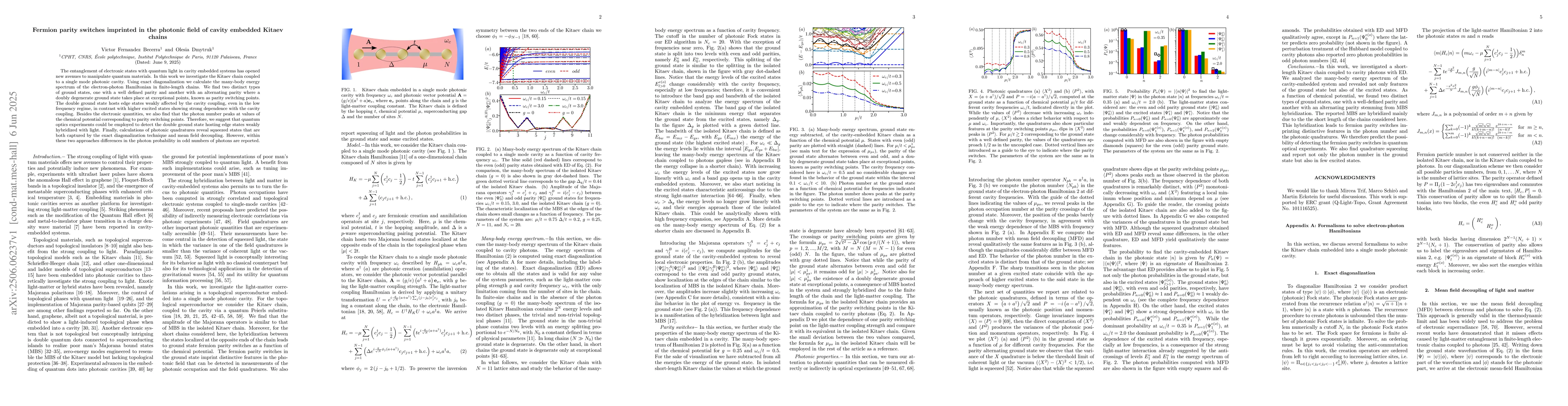 The entanglement of electronic states with quantum light in cavity embedded systems has opened new avenues to manipulate quantum materials. In this work we investigate the Kitaev chain coupled to a single mode photonic cavity. Using exact diagonalization we calculate the many-body energy spectrum of the electron-photon Hamiltonian in finite-length chains. We find two distinct types of ground states, one with a well defined parity and another with an alternating parity where a doubly degenerate ground state takes place at exceptional points, known as parity switching points. The double ground state hosts edge states weakly affected by the cavity coupling, even in the low frequency regime, in contrast with higher excited states showing strong dependence with the cavity coupling. Besides the electronic quantities, we also find that the photon number peaks at values of the chemical potential corresponding to parity switching points. Therefore, we suggest that quantum optics experiments could be employed to detect the double ground state hosting edge states weakly hybridized with light. Finally, calculations of photonic quadratures reveal squeezed states that are both captured by the exact diagonalization technique and mean field decoupling. However, within these two approaches differences in the photon probability in odd numbers of photons are reported.