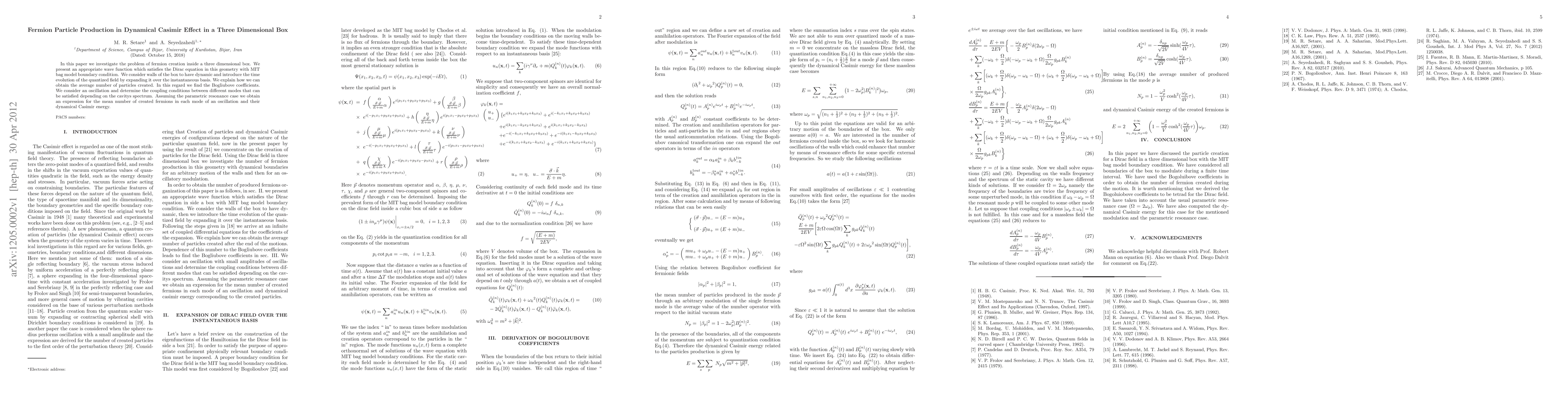 Researchers investigate fermion particle creation in a 3D box using the Dirac equation and dynamic Casimir effect, finding an expression for the mean number of created fermions.