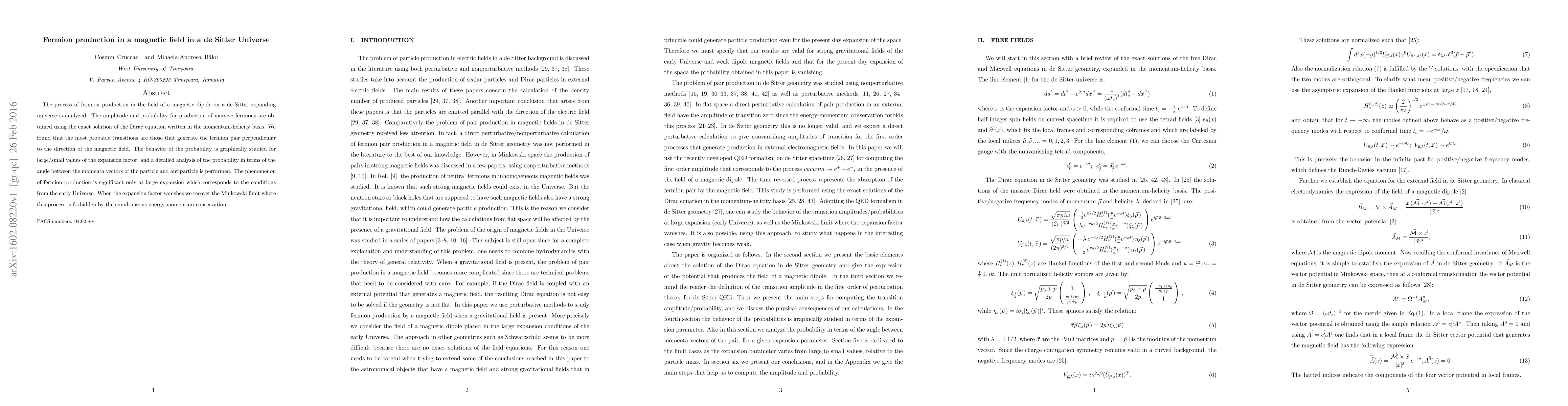 This paper investigates fermion production in a magnetic dipole field within a de Sitter expanding universe, finding that the most probable transitions generate fermion pairs perpendicular to the magnetic field. The study reveals significant fermion production only at large expansion factors, corresponding to early Universe conditions, while the Minkowski limit prohibits this process.