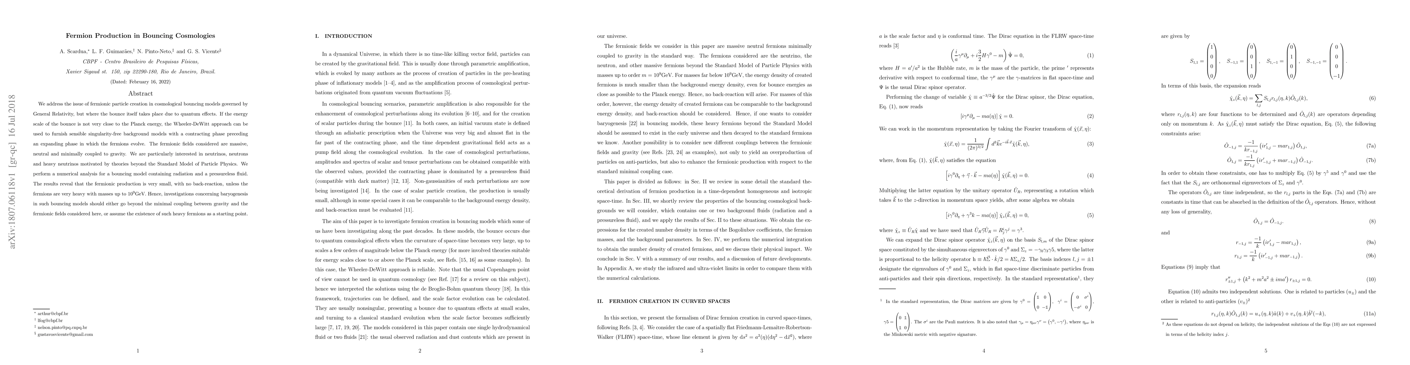 This paper investigates fermionic particle creation in bouncing cosmological models driven by quantum effects, focusing on neutrinos, neutrons, and heavy neutrinos. The study finds minimal fermionic production unless fermions have extremely high masses, suggesting that baryogenesis in such models may require either non-minimal couplings or the assumption of heavy fermions.