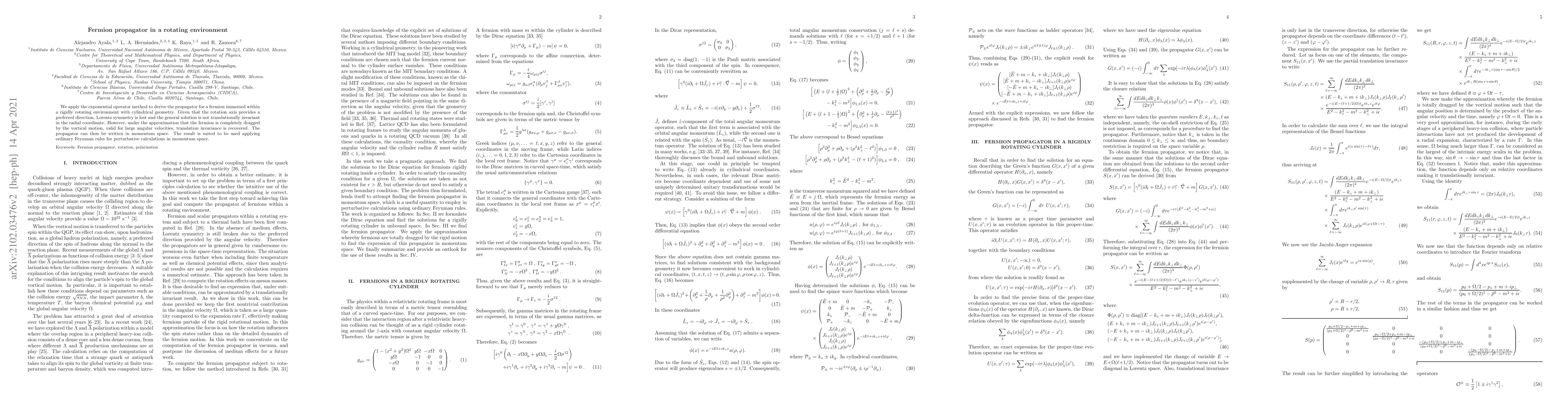 Researchers derived a fermion propagator in a rotating environment using the exponential operator method, finding that translation invariance is recovered for large angular velocities when the particle is completely dragged by vortical motion.