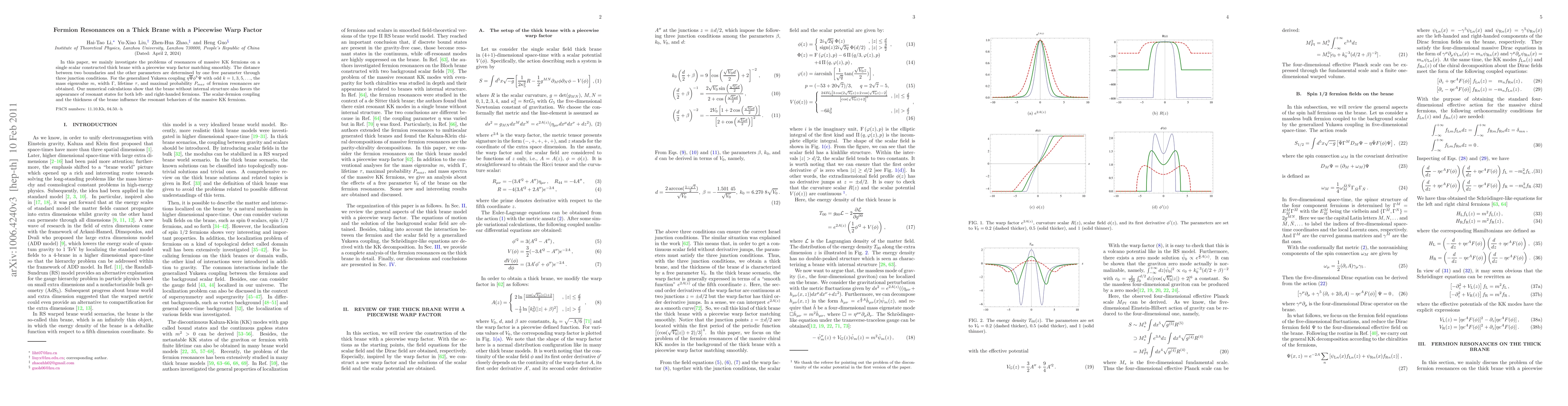 In this paper, we mainly investigate the problems of resonances of massive KK fermions on a single scalar constructed thick brane with a piecewise warp factor matching smoothly. The distance between two boundaries and the other parameters are determined by one free parameter through three junction conditions. For the generalized Yukawa coupling $\eta\bar{\Psi}\phi^{k}\Psi$ with odd $k=1,3,5,...$, the mass eigenvalue $m$, width $\Gamma$, lifetime $\tau$, and maximal probability $P_{max}$ of fermion resonances are obtained. Our numerical calculations show that the brane without internal structure also favors the appearance of resonant states for both left- and right-handed fermions. The scalar-fermion coupling and the thickness of the brane influence the resonant behaviors of the massive KK fermions.