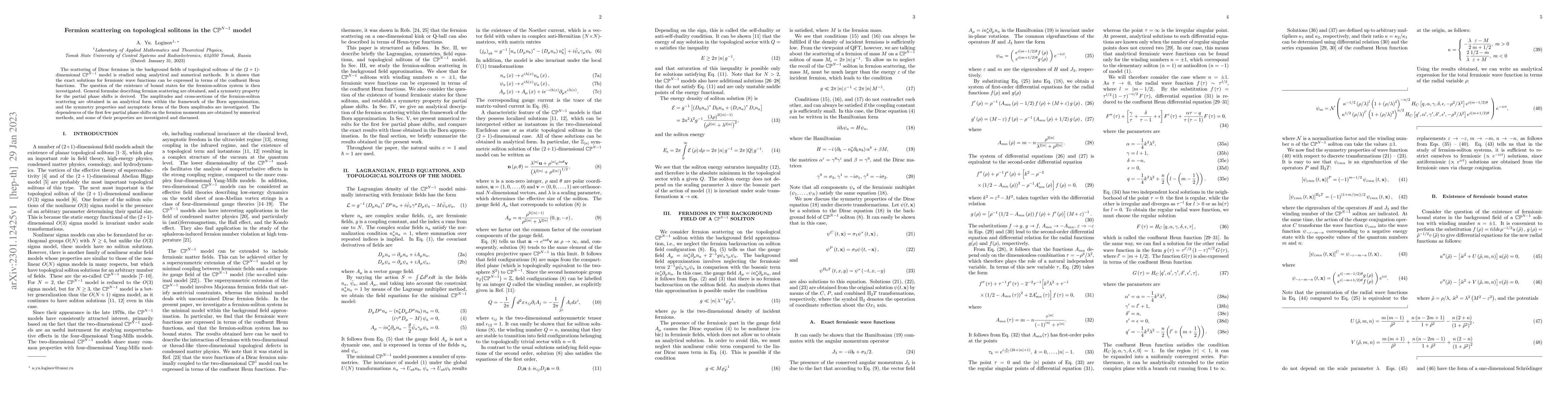 This paper investigates the scattering of Dirac fermions in the $(2+1)$-dimensional $\mathbb{CP}^{N-1}$ model's topological soliton background, deriving exact solutions for fermionic wave functions in terms of confluent Heun functions. It explores the existence of bound states and provides analytical expressions for scattering amplitudes and cross-sections using the Born approximation.