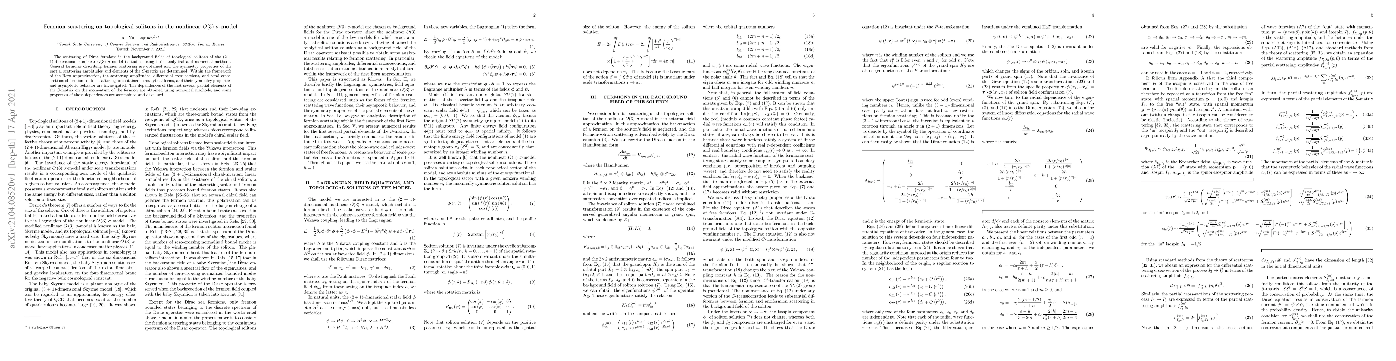 This paper investigates the scattering of Dirac fermions in the background of topological solitons in the $(2+1)$-dimensional nonlinear $O(3)$ $\sigma$-model, deriving analytical and numerical results for scattering amplitudes and $S$-matrix elements, and analyzing their symmetry properties and asymptotic behavior.