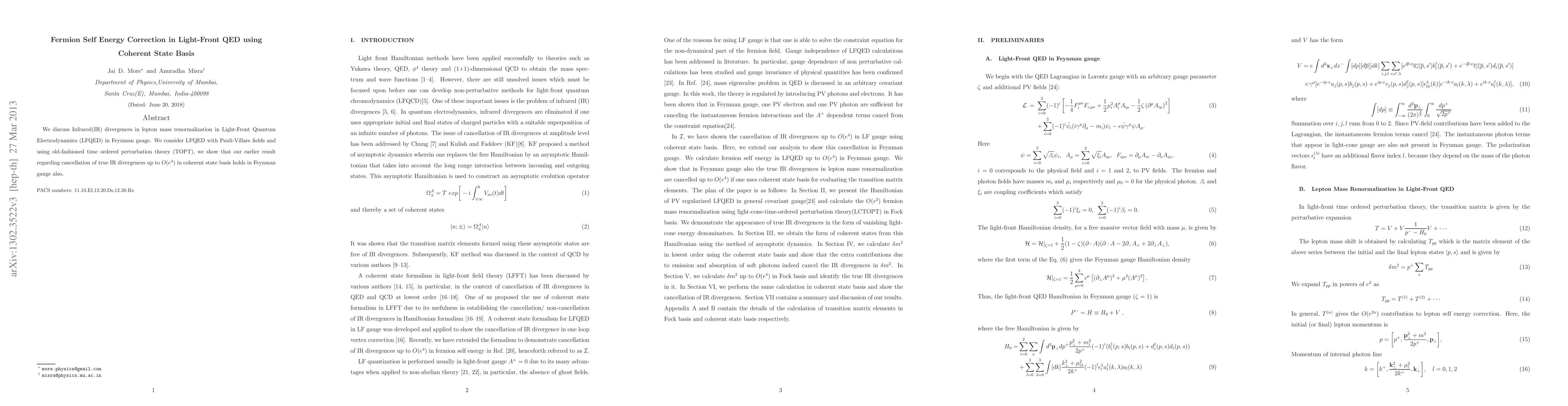 The paper investigates infrared (IR) divergences in lepton mass renormalization within Light-Front Quantum Electrodynamics (LFQED), specifically in Feynman gauge. Using Pauli-Villars fields and old-fashioned time-ordered perturbation theory, the authors confirm their previous finding that true IR divergences up to $O(e^4)$ cancel out in a coherent state basis, a result now applicable to Feynman gauge as well.