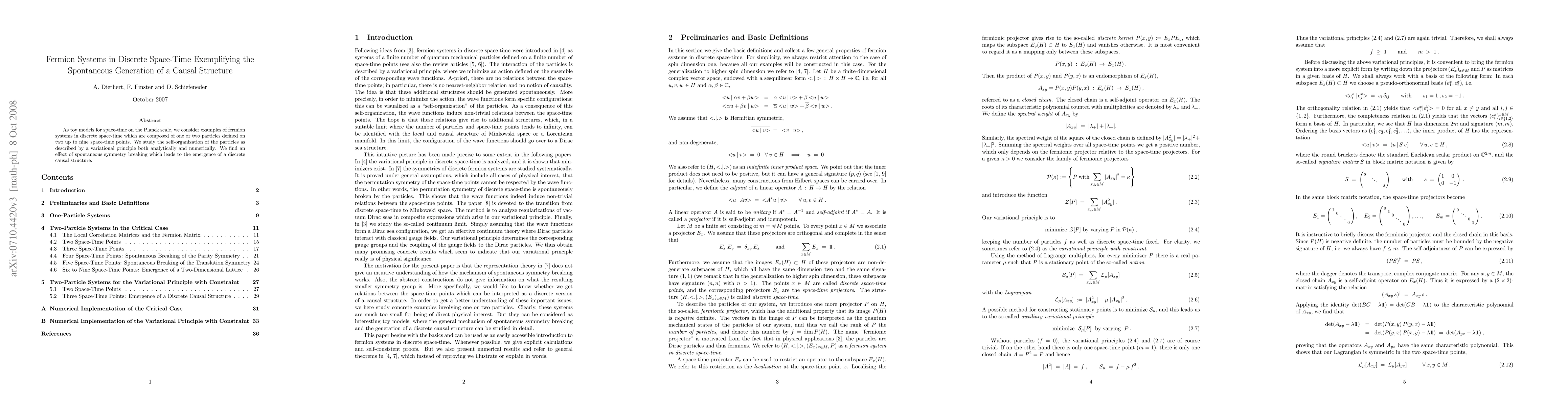 This paper explores fermion systems in discrete space-time as toy models for Planck-scale space-time, demonstrating through analytical and numerical methods that these systems can spontaneously generate a causal structure due to symmetry breaking.