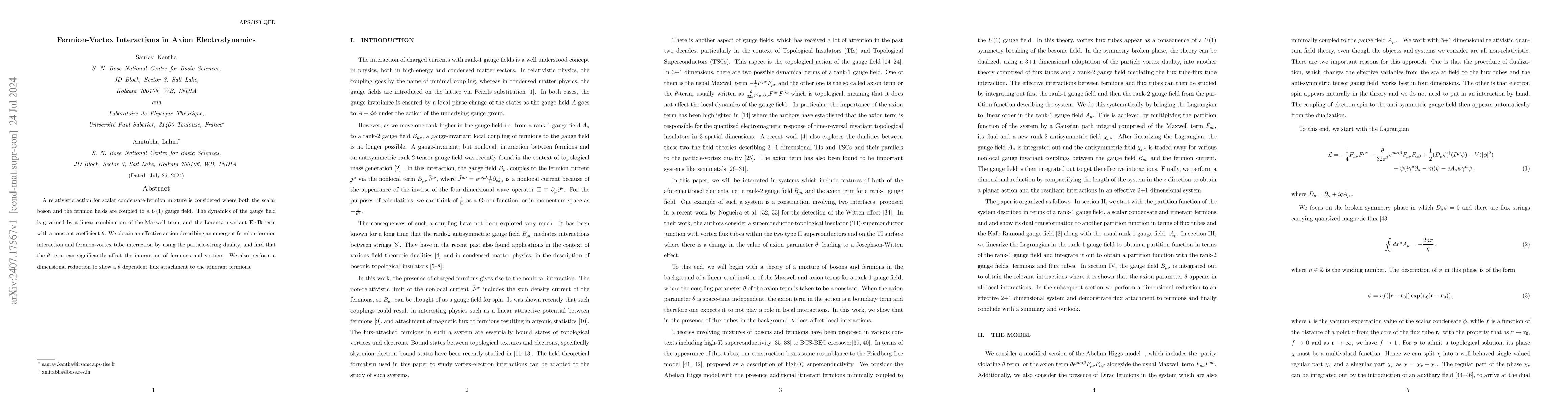 This research explores the dynamics of fermions interacting with vortices in a relativistic axion electrodynamics framework, revealing significant effects of the $\theta$ term on fermion-vortex and fermion-fermion interactions, alongside a dimensional reduction demonstrating $\theta$-dependent flux attachment to fermions.