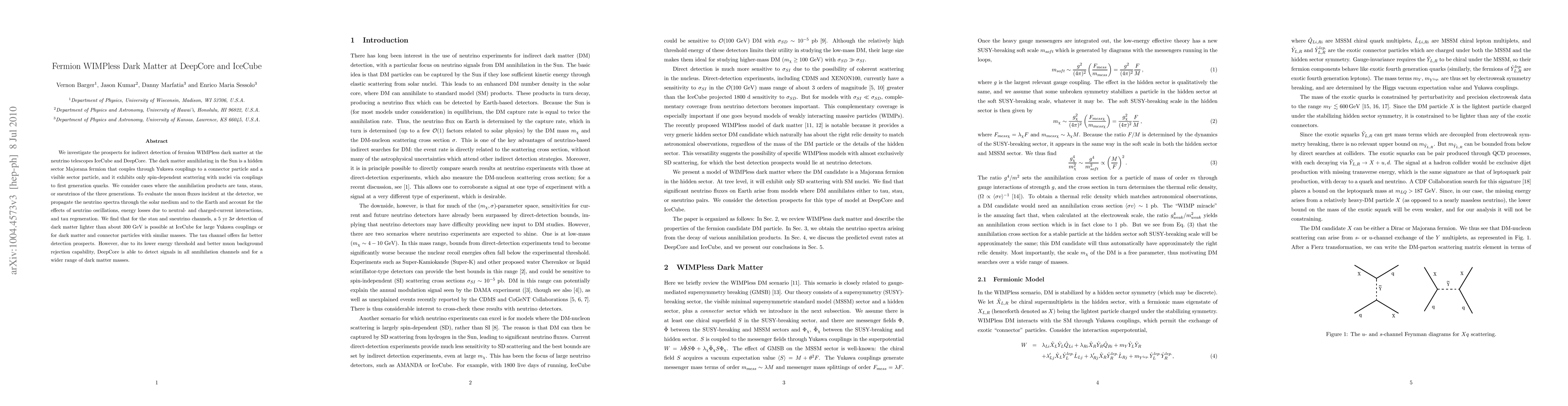 This paper explores the potential for detecting fermion WIMPless dark matter via neutrino telescopes IceCube and DeepCore, focusing on Majorana fermion dark matter that annihilates in the Sun. DeepCore is shown to have superior detection capabilities across various annihilation channels and mass ranges due to its lower energy threshold and better background rejection.