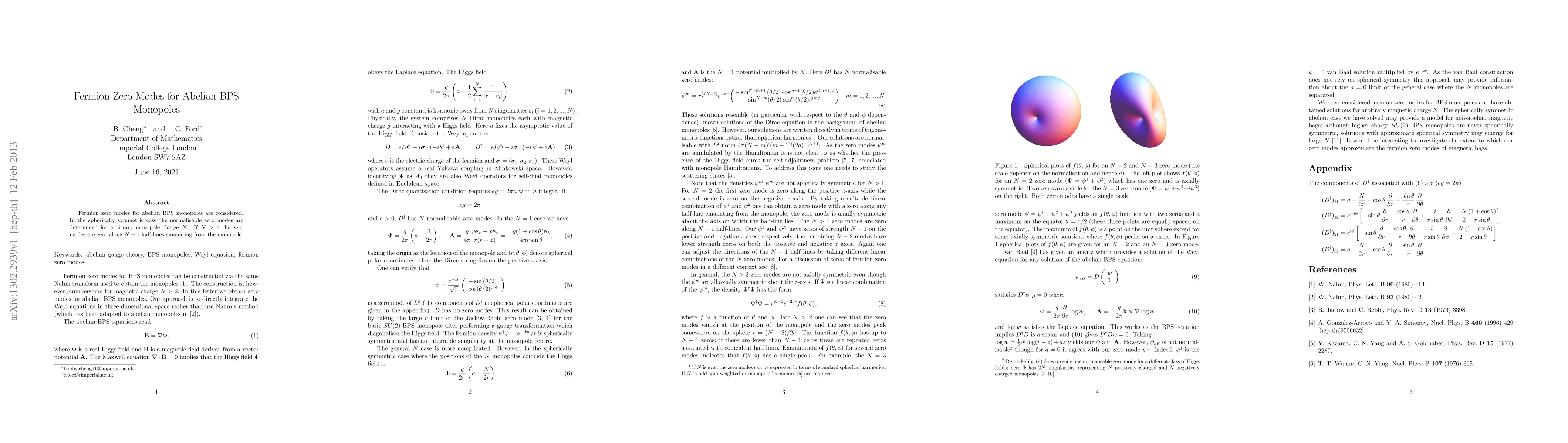 **Summary:** This research determines the normalizable fermion zero modes for abelian BPS monopoles in spherical symmetry, showing that for monopole charge N > 1, the zero modes extend along N-1 half-lines from the monopole.