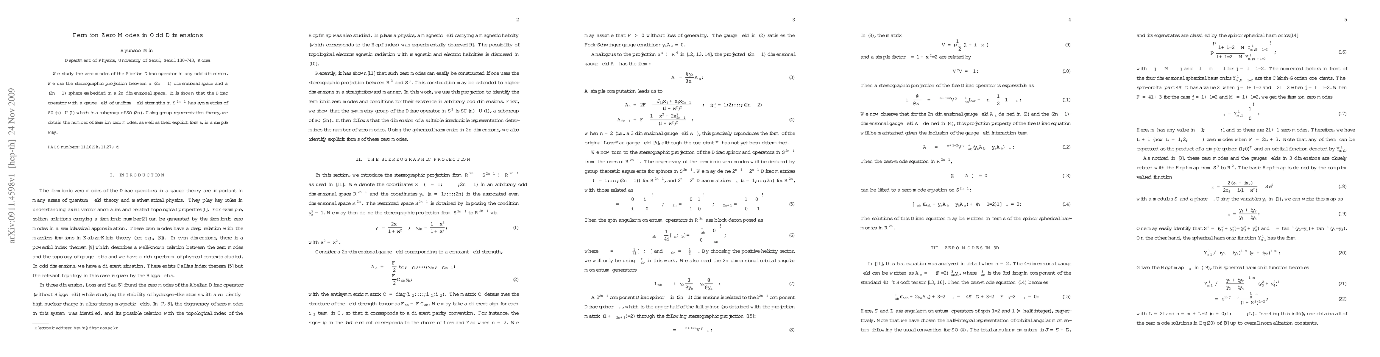 Researchers studied fermion zero modes in odd dimensions using stereographic projection and group representation theory, finding symmetries of SU(n) x U(1) and explicit forms of the zero modes.